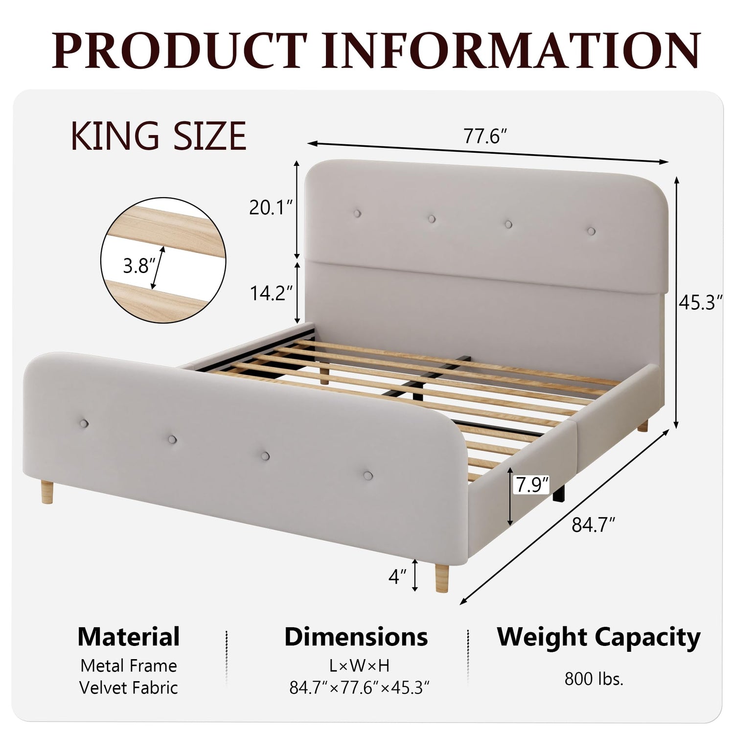 - 【Rounded Headboard】The headboard features rounded corners to protect against knocks and is wrapped in velvet fabric with high resilience foam padding to provide strong back support. And the footboard rises 9.8 inches above the bed's side panels, allowing the mattress to fit perfectly inside the frame and preventing it from sliding around