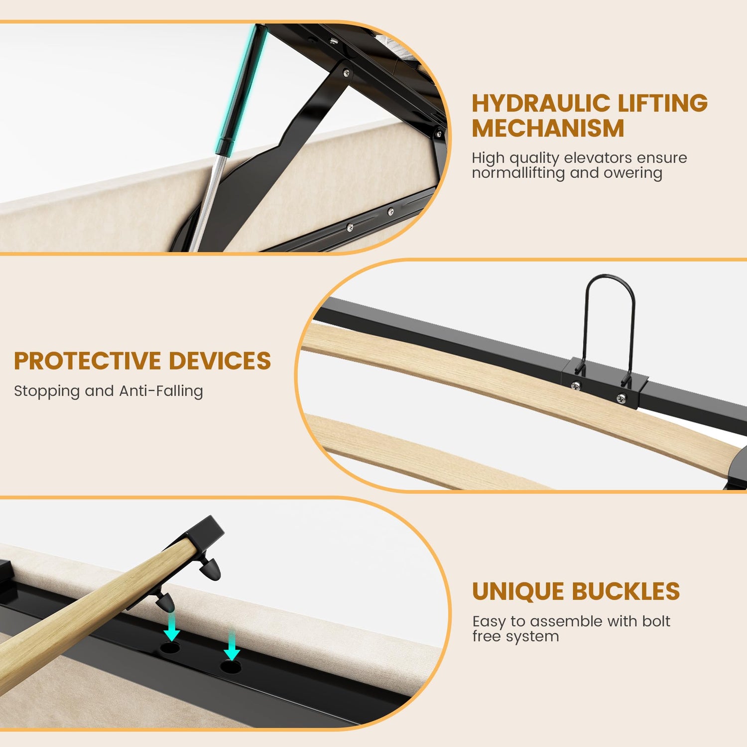 - Innovative Hydraulic Lift Technology: Effortless opening and easy access! Our advanced hydraulic bed frame with storage ensures the beige king bed frame lifts smoothly and quietly, allowing you to quickly access stored items without any hassle.