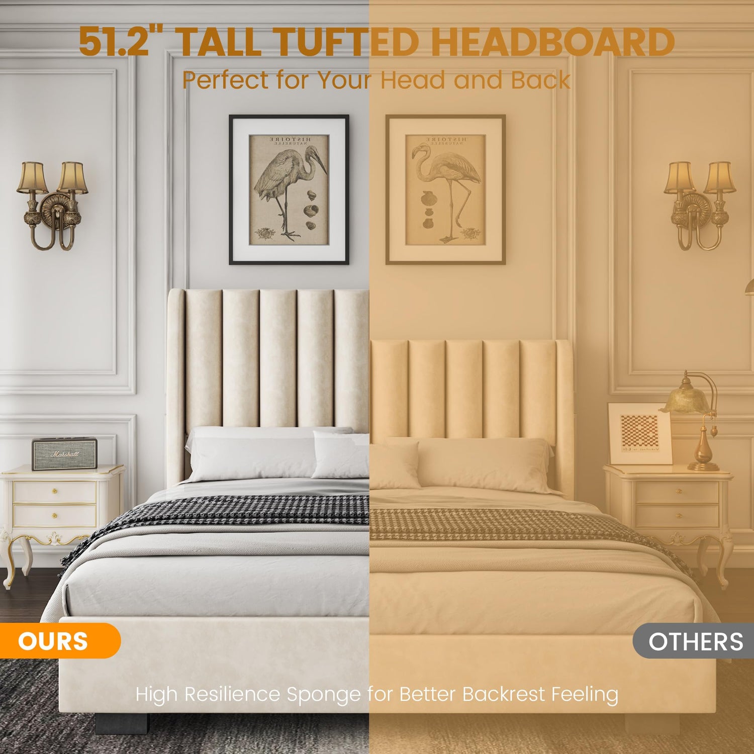 King Size Upholstered Lift Up Storage Bed Frame with 51.2" Tall Headboard, Velvet Wingback Tufted Design, Wood Slats Support, No Box Spring Required, Noise-Free Double Low Bed Frame (King,Beige)