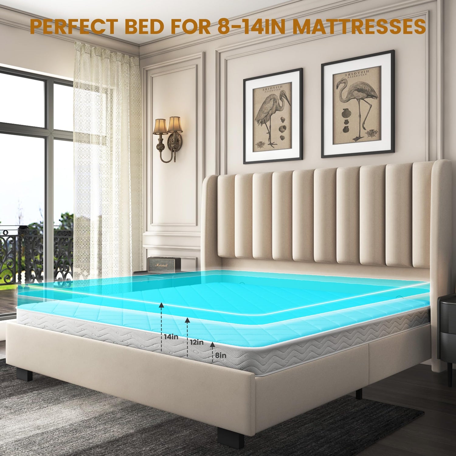 - Quiet Design: Create a peaceful sleep environment. Our unique wingback design effectively prevents mattress movement, while 12 micro-arched wooden slats evenly distribute weight and provide shock absorption. These wooden slats enhance the bedframe's flexibility and eliminate the need for a box spring, significantly reducing noise so you can enjoy a tranquil and comfortable night's sleep every night.