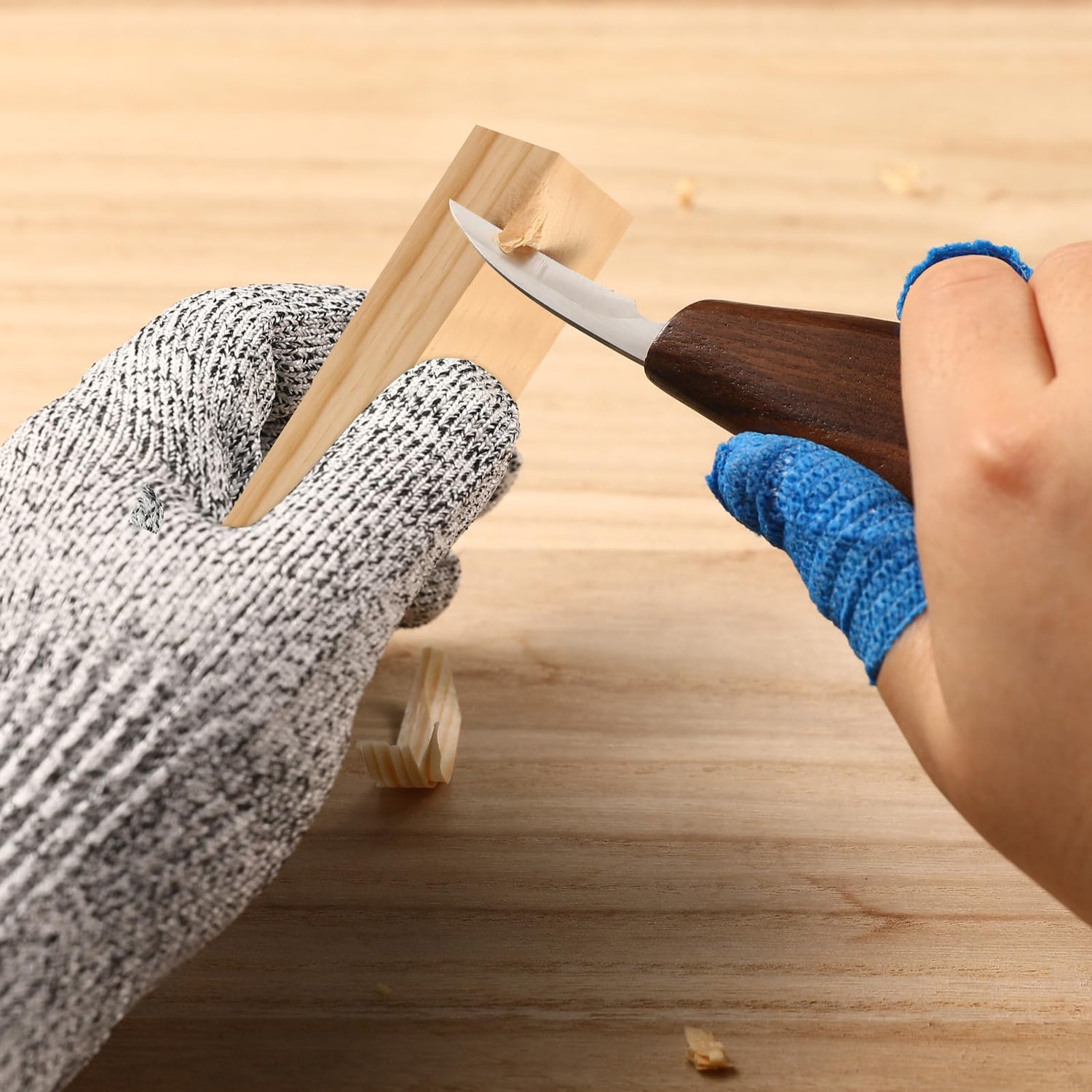 - All in One: Whittling knife × 4, chiselling knifes × 6, cut-resistant glove × 2, self-defensive bandage × 2, leather stripe × 1, polishing compound × 1, sharpening stone × 1, wood block × 14, storage box × 1, blade protector × 10, package box × 1.
