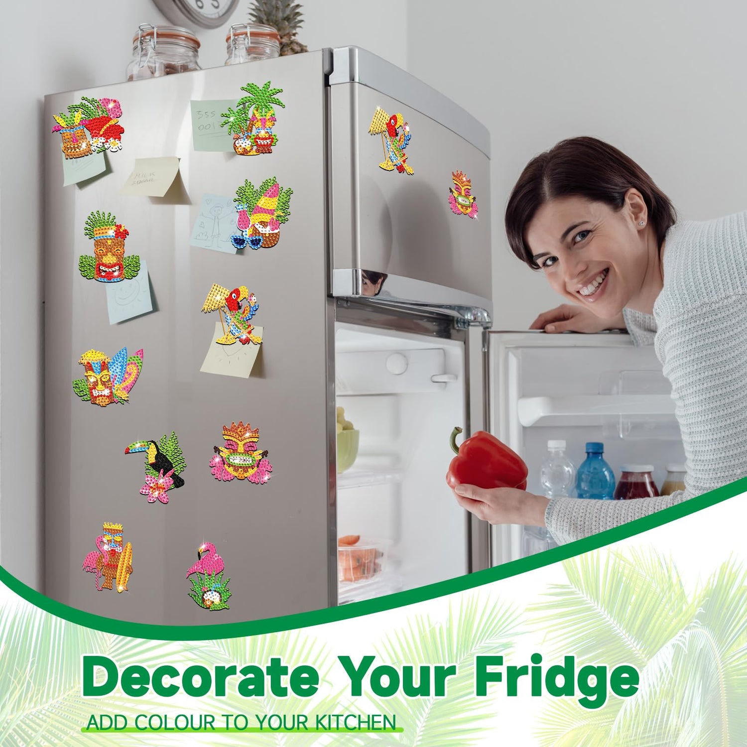 - Tiki Theme Design: these summer diamond magnet refrigerator magnets adopt beautiful tiki patterns, including various tiki images, flamingos, palm trees, parrots, hibiscus flowers, watermelons, beach chairs, etc.; These colorful and vibrant designs are sure to bring a cheerful summer atmosphere to your home
