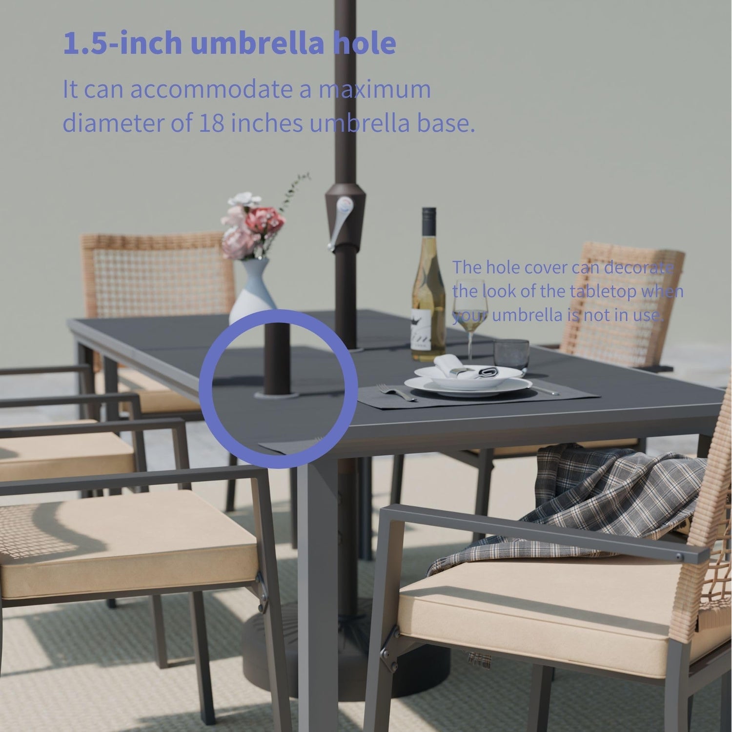 - 【Large Dining Table with Umbrella Hole】The spacious 63" L x 36.7" W x 28.7" H table provides ample room for meals and drinks. Its textured surface is slip-resistant and easy to clean. The built-in 1.5" umbrella hole allows you to add shade effortlessly for sunny days.