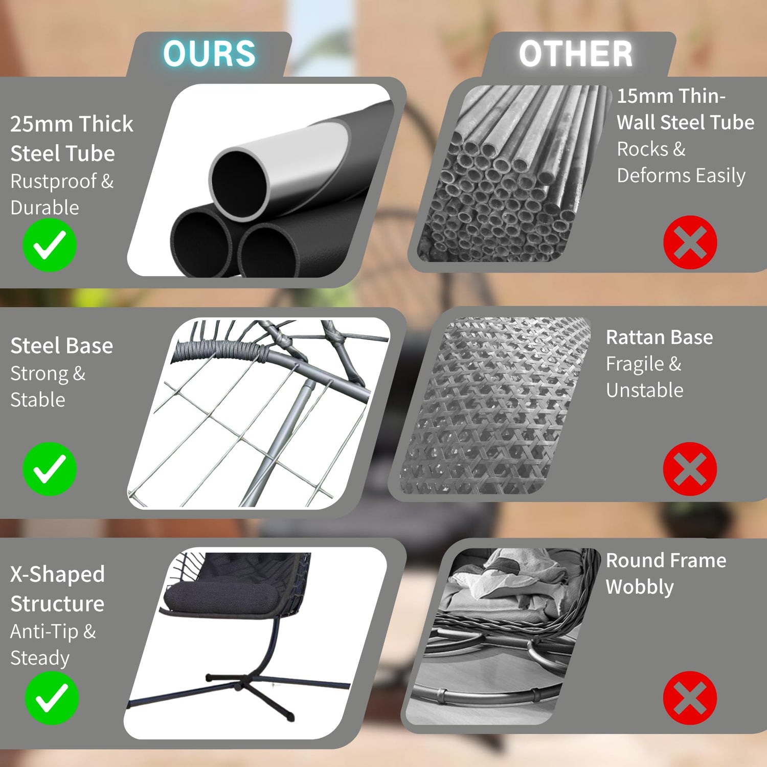 - 【Premium Anti-Rust Coating for Enhanced Durability】 The egg swing chair stand features a high-temperature baked paint finish that offers exceptional resistance to rust and corrosion, even in humid or outdoor conditions. Unlike standard spray coatings, this finish provides a more consistent and durable layer that resists peeling and fading over time, ensuring your outdoor hanging chair maintains its pristine appearance.