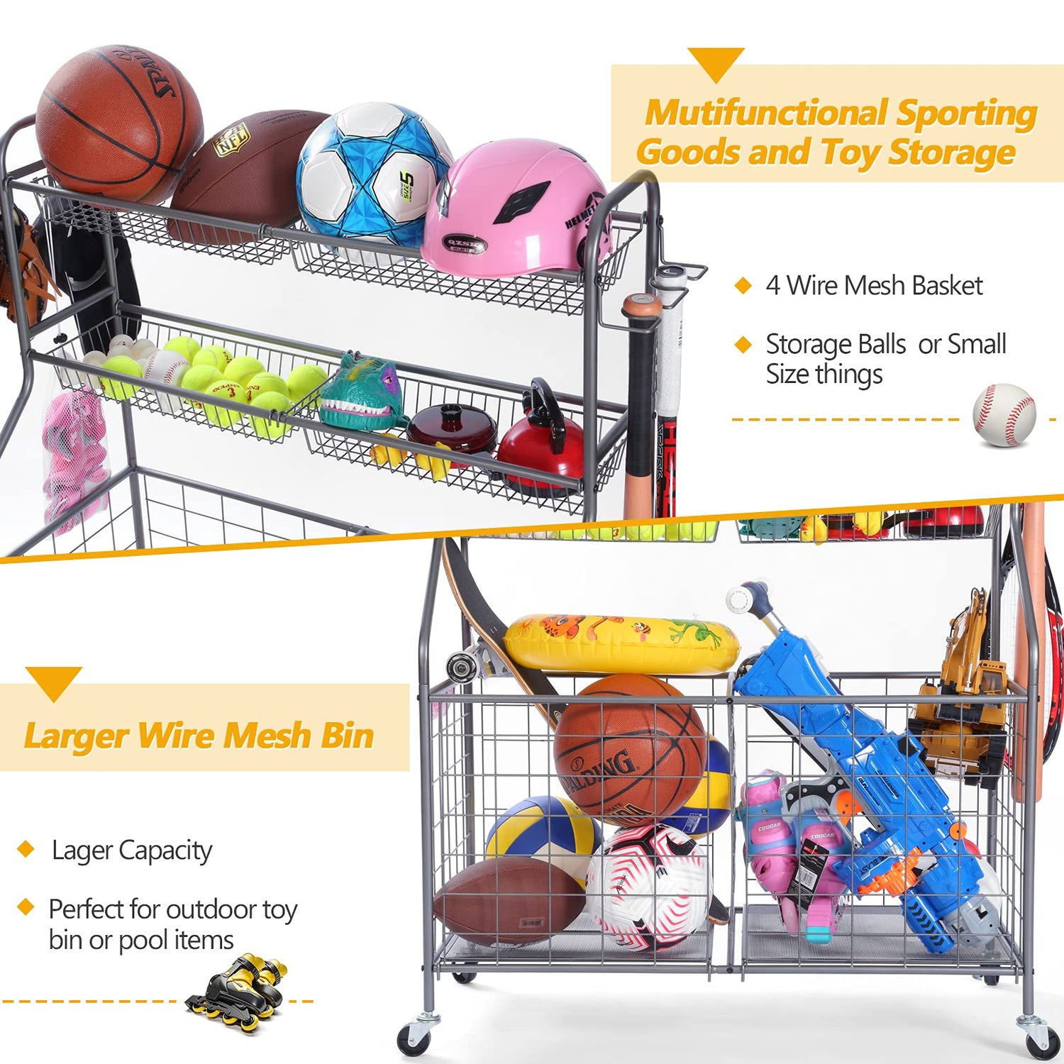 - BIG CAPACITY BASKETBALL RACK:The Rolling Sports Ball Basket features in 4 heavy-duty smooth rolling wheels, Indoor Outdoor Design, which is easy to move the organizer anywhere and fits in a specific position.It is ideal for the garage, home, Storage room, playroom, gym, playgroup and schools