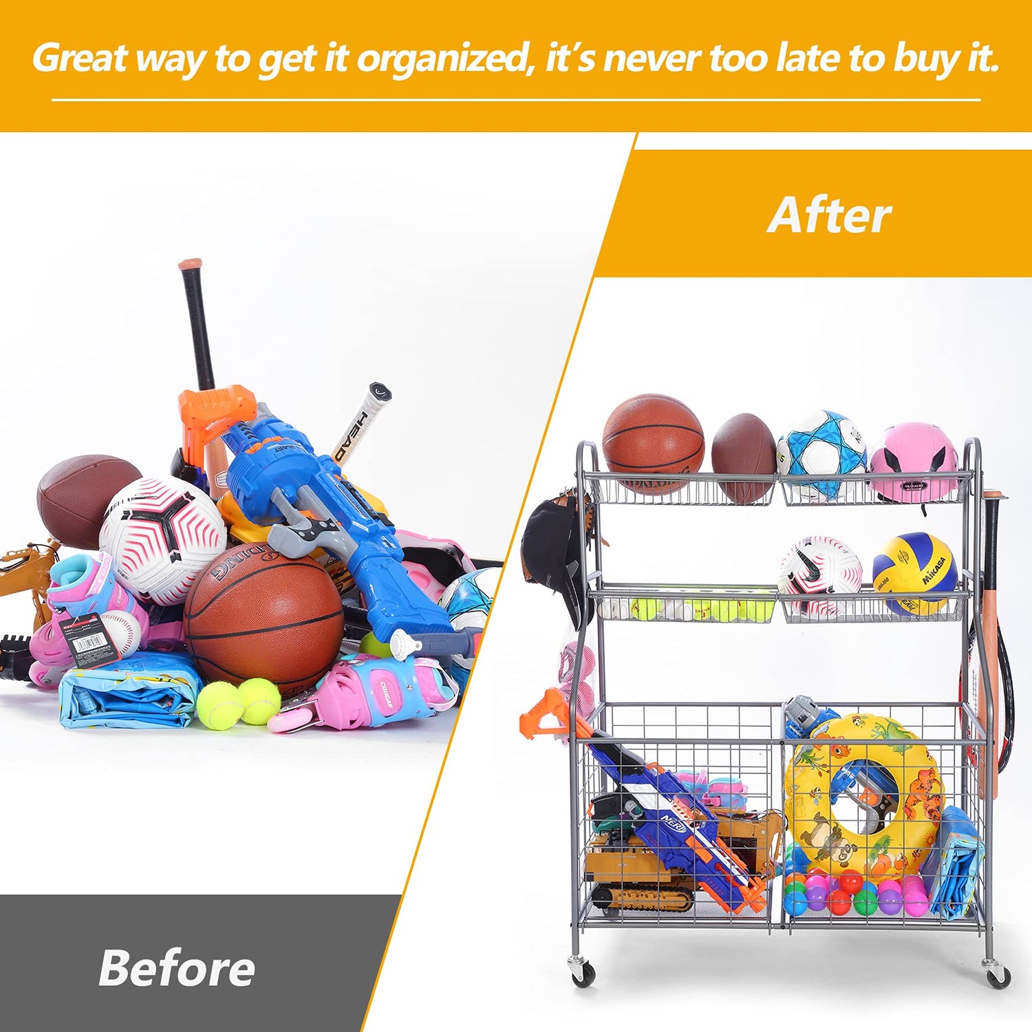 - EASY TO ASSEMBLE AND STABLE: Made of a durable coated steel frame, the sports storage organizer offers long-lasting strength and impressive performance. Simple structure makes it easy to assemble quickly with the help of instruction and tools included