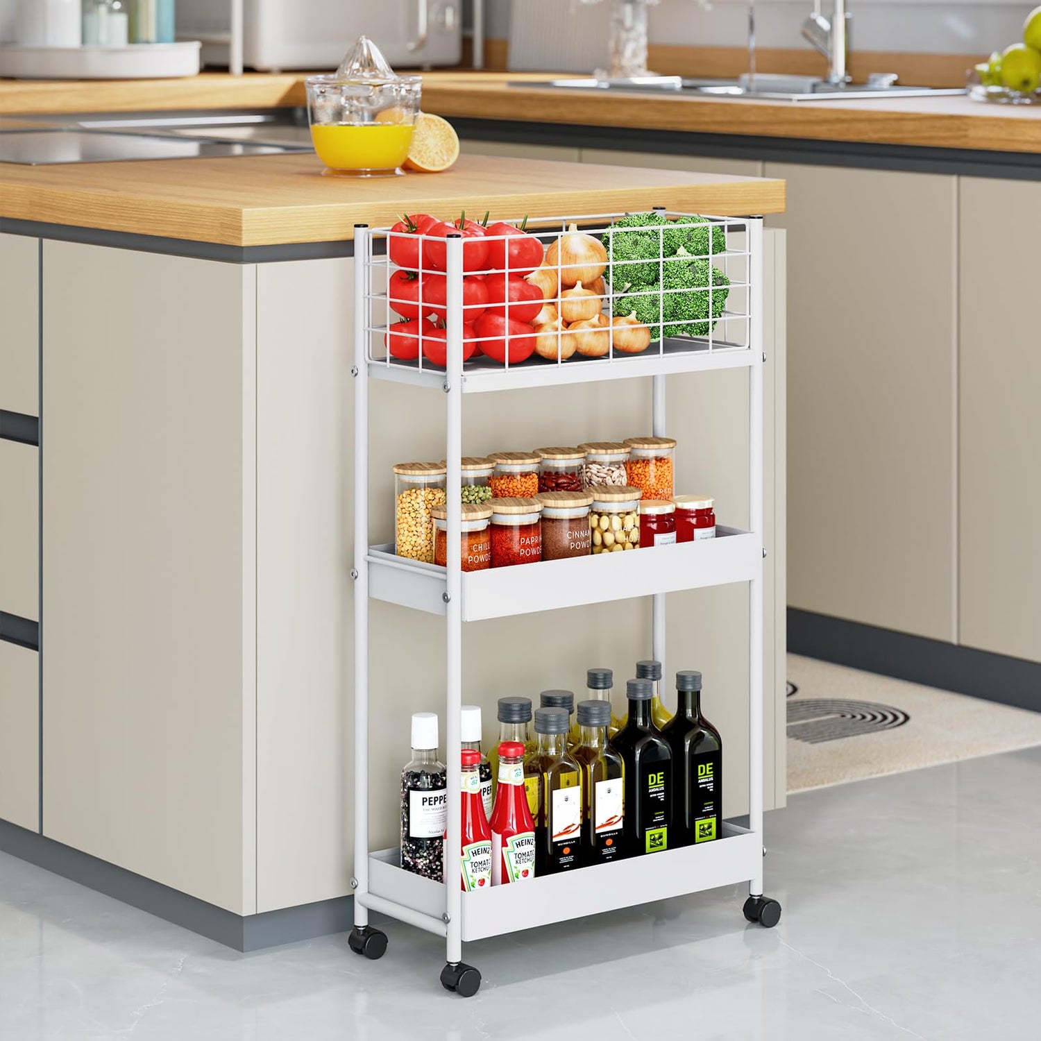 KINGRACK 3-Tier Rolling Utility Cart with Wheels, Metal Slim Storage Cart, Multifunctional Storage Organizer, Rolling Storage Cart for Kitchen, Office, Bathroom, Narrow Place, White