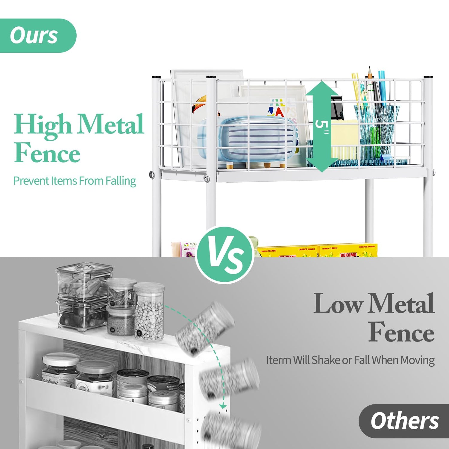 - HIGH MESH GUARDRAIL: Unique mesh top design give this rolling cart a fashion and elegant look. The top shelf not only offer wires to use hooks and place good -looking items, but also support you with paper clips to display your photographs on mesh top to satisfy the students' daily use at the dorms, and to add fun to daily life. You can discover more storage solutions and interesting ideas in the process of using this cart