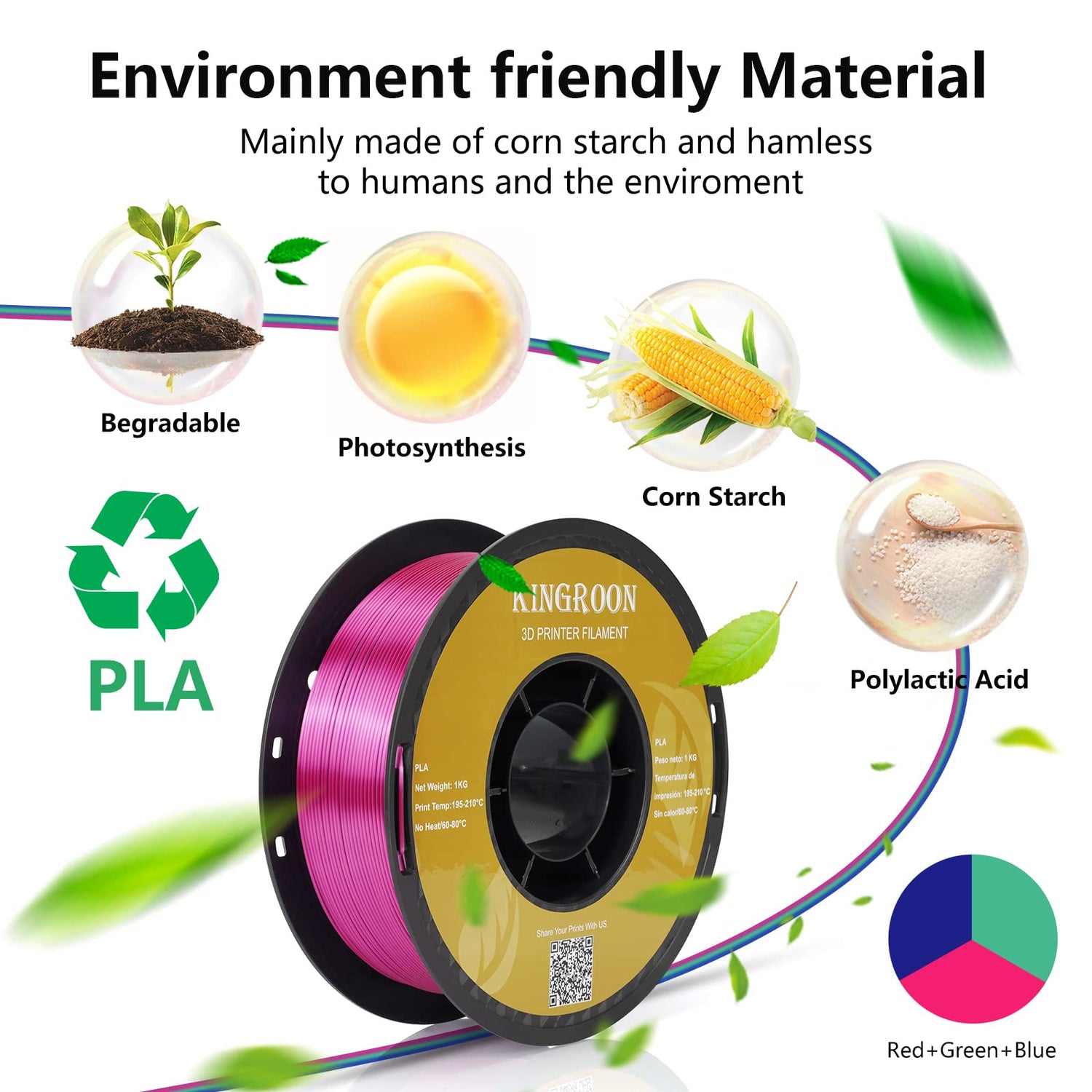 - Toughness Enhanced Silk PLA Filaments: Kingroon PLA filaments have the advantages of incredible ease of printing Optimized printing quality, high purity with low shrinkage and superb layer bonding, meeting your demands for printing projects of functional parts with higher toughness.