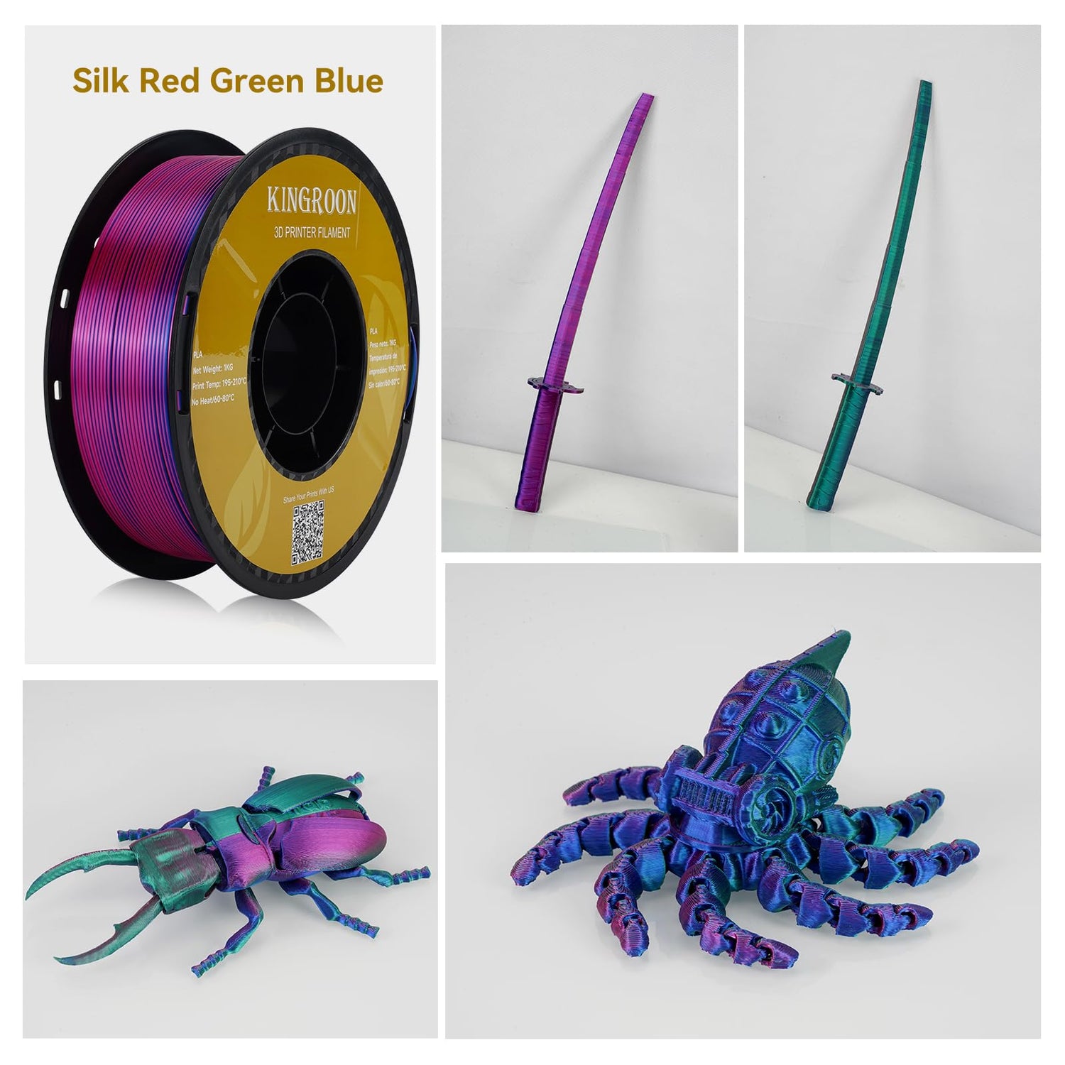 Kingroon PLA 3D Printer Filament, Triple Color Silk PLA Filament, Dimensional Accuracy +/- 0.03 mm, 1 kg Spool(2.2lbs), 1.75 mm, Red Blue Green