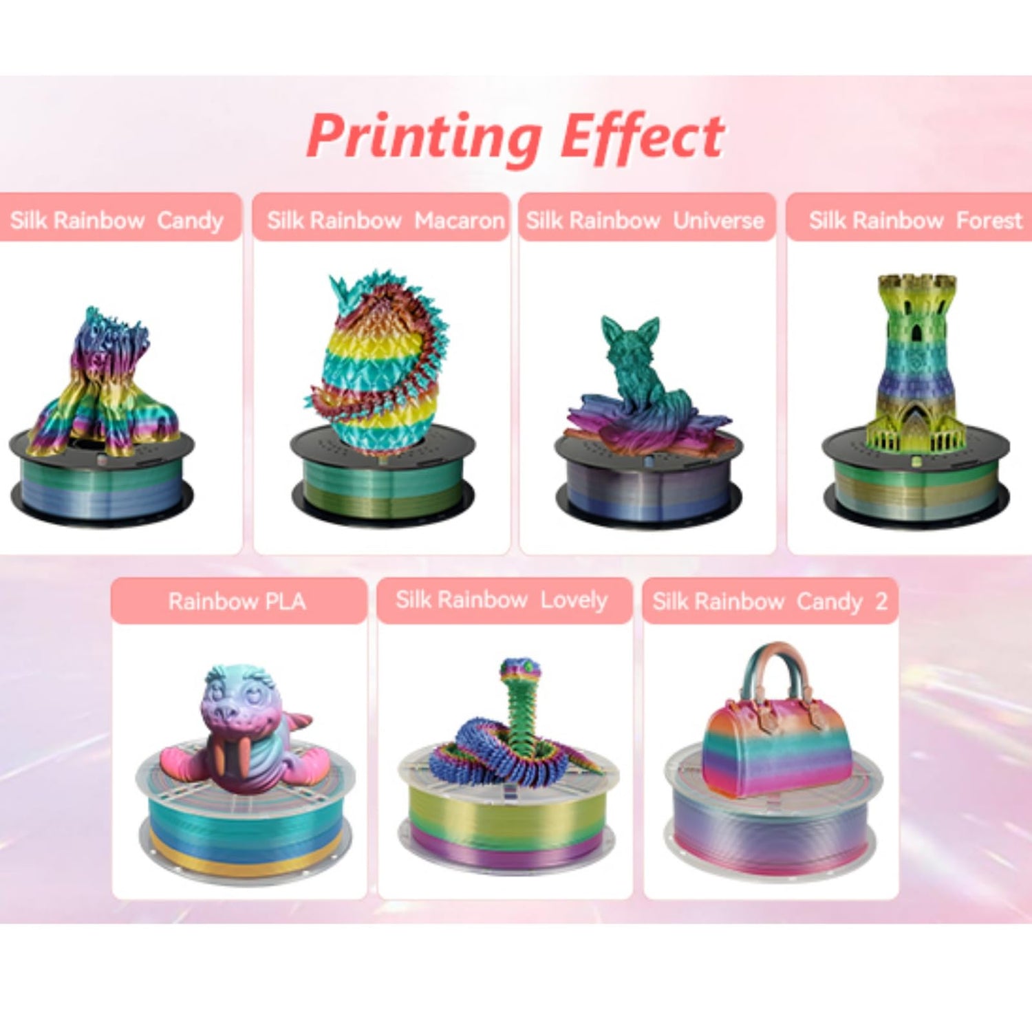 - 【Silk Rainbow PLA】 Shinny surface with silk luster, giving smooth, pearly and unique touch.Fast colors change every 4-8 meters