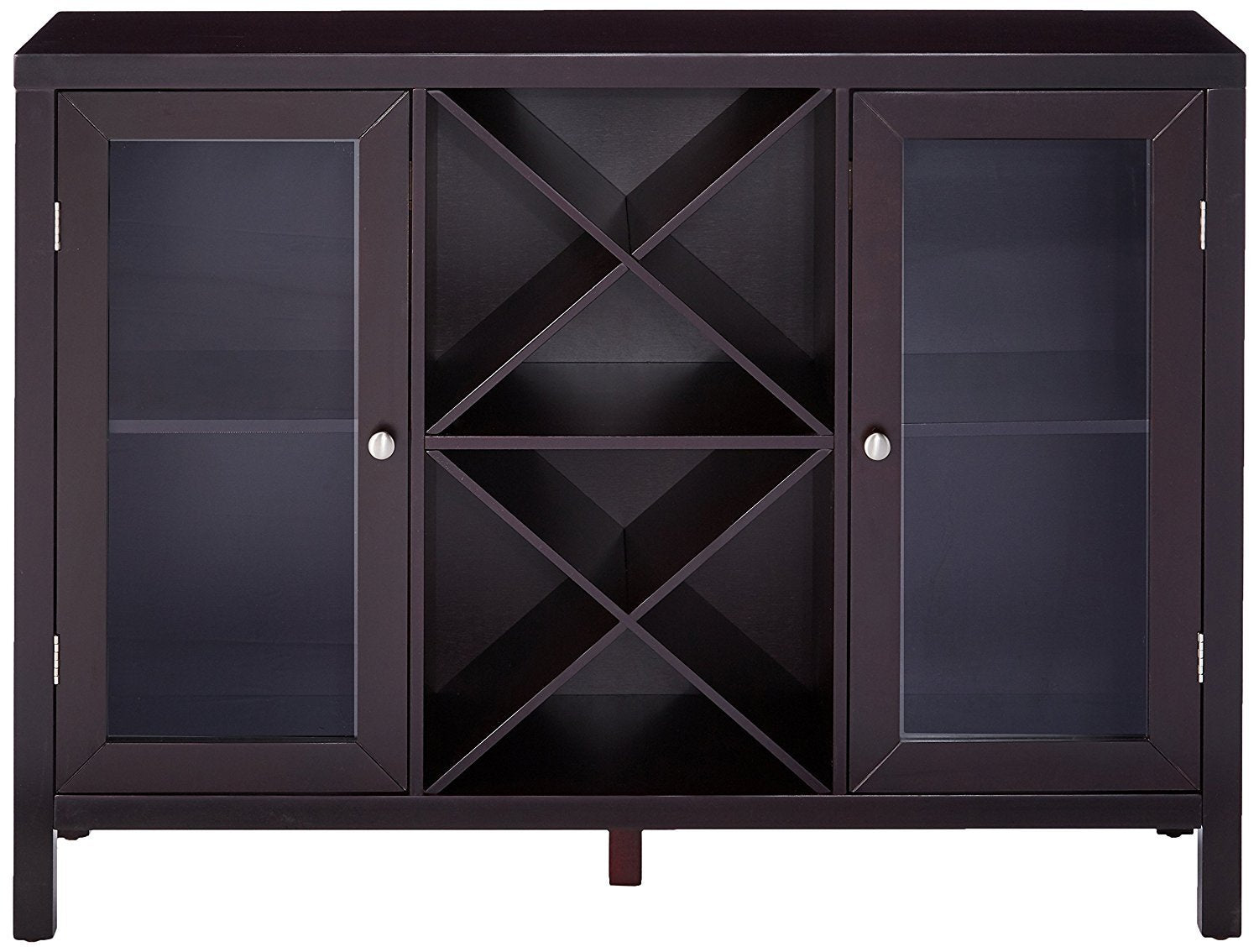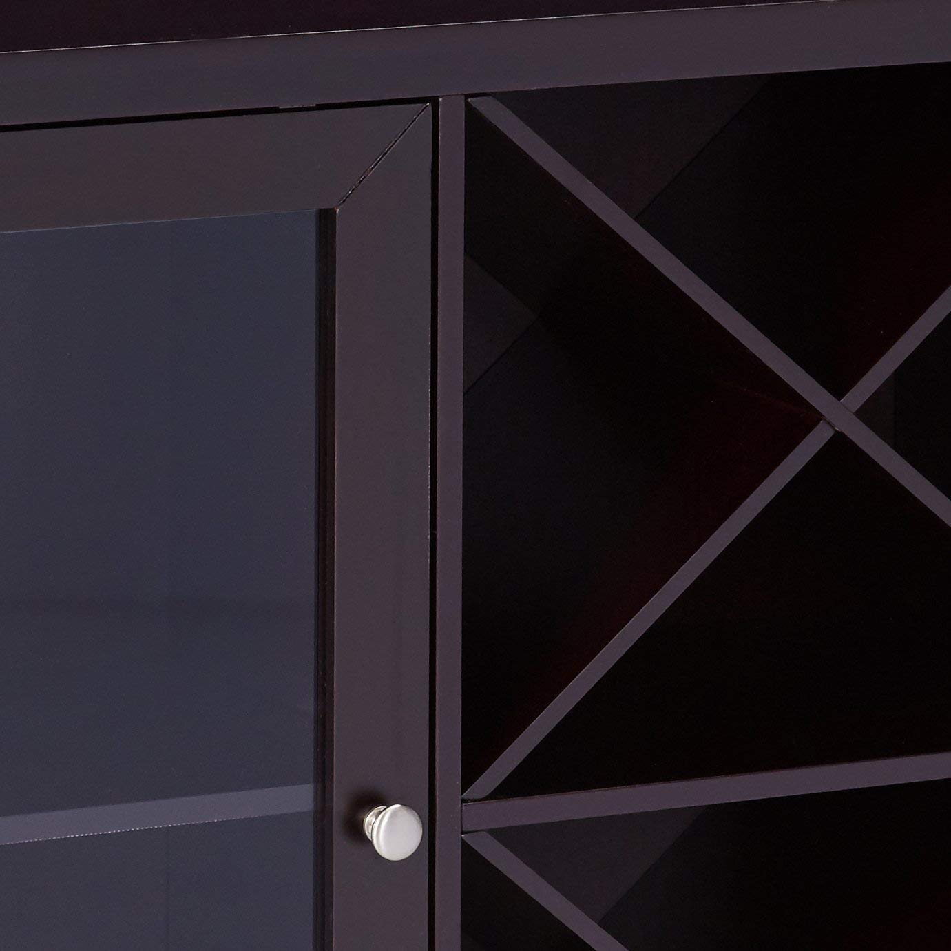 Features Finish: Espresso. Material: Wood. Doors: Glass. Number of Cabinets: 2. Wine Rack: 8 Compartments Number of Interior Shelves: 1 Behind Each Door Wine Rack Bottle Capacity: 24 Assembly: Required