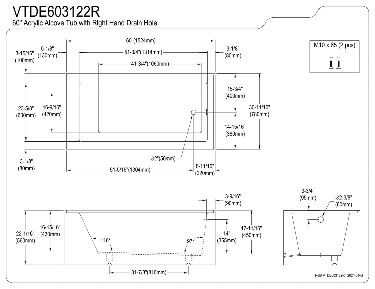 - Product dimensions – 30-11/16" W x 60" L x 22-1/6" H | Water depth – 14” to overflow | Tub capacity – 58.2 gallon | Weight – 95 lbs.