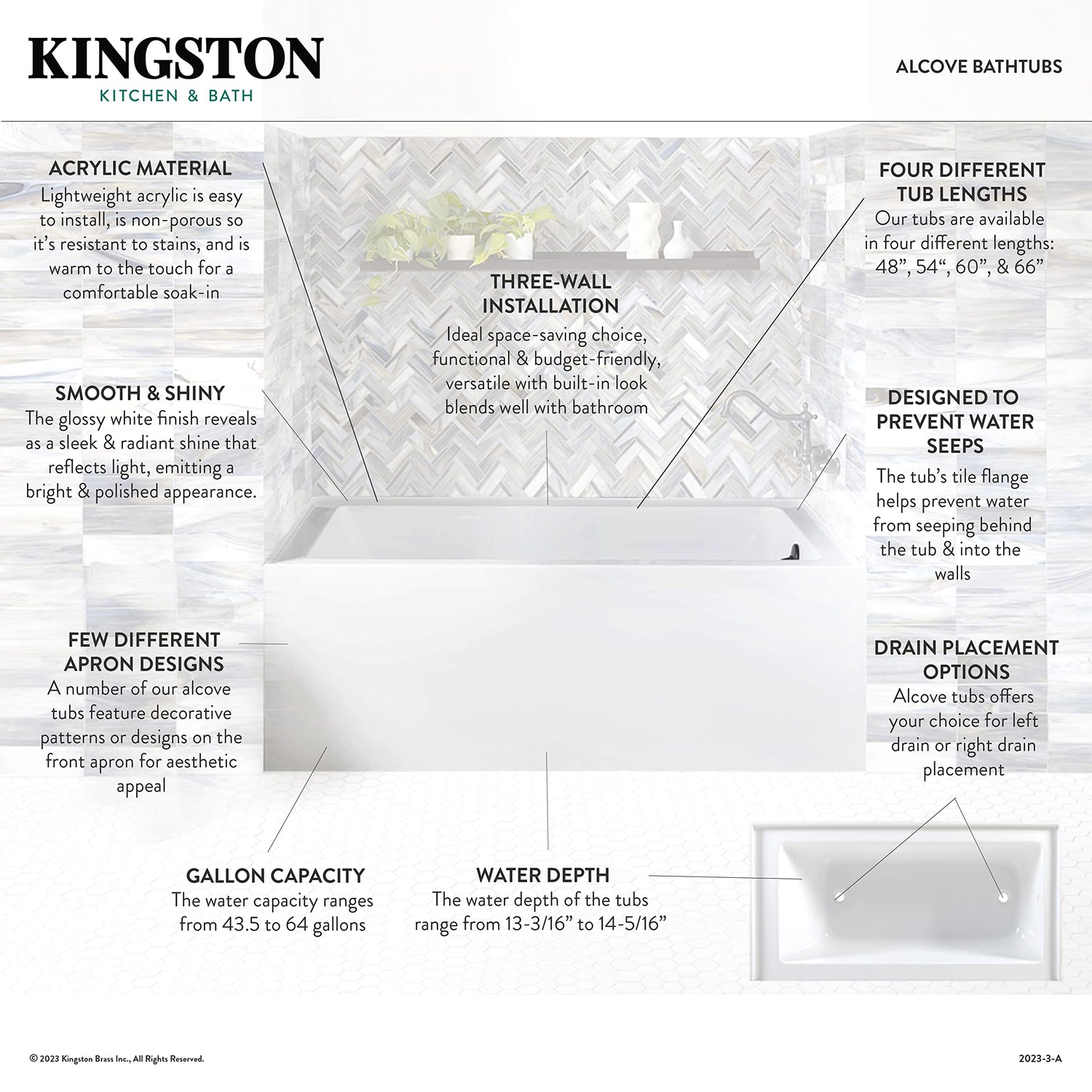KINGSTON BRASS VTDE603122R 60-Inch Contemporary Alcove Acrylic Bathtub with Right Hand Drain and Overflow Holes, White