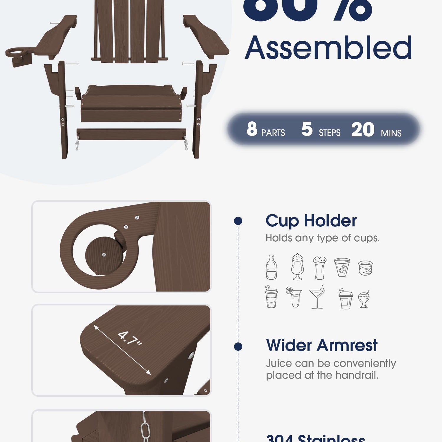 - 80% Pre-assembled: This Adirondack reclining chair will come with 8 parts, clear instructions and necessary hardware provided. Only need 5 steps according to the manual included or the video we uploaded, and you will get a fashion composite Adjustable Adirondack Chair .(ATTENTION: Please don't over tighten Nuts at step 3, ensure the bolts can adjust for backrest reclining)