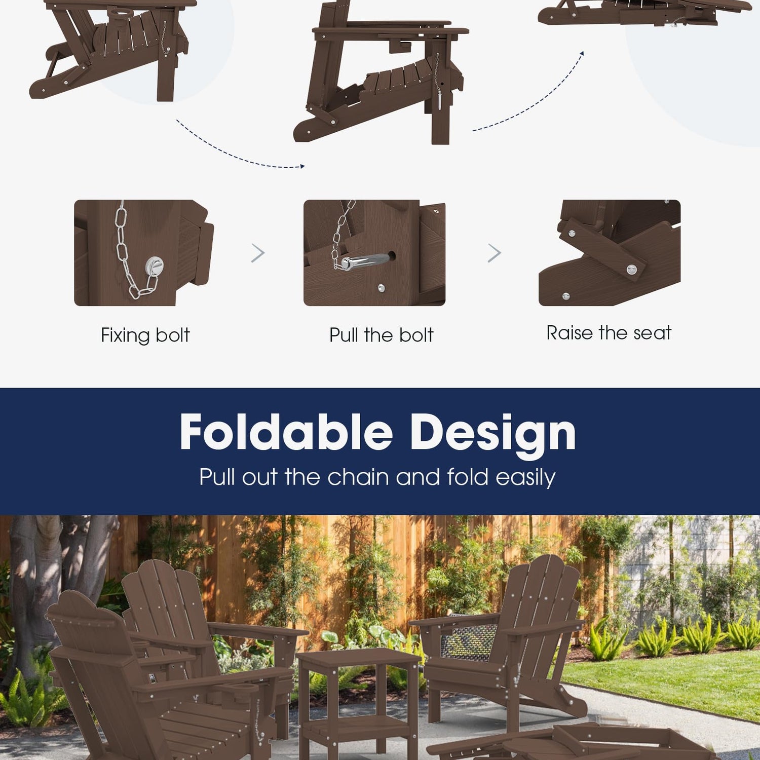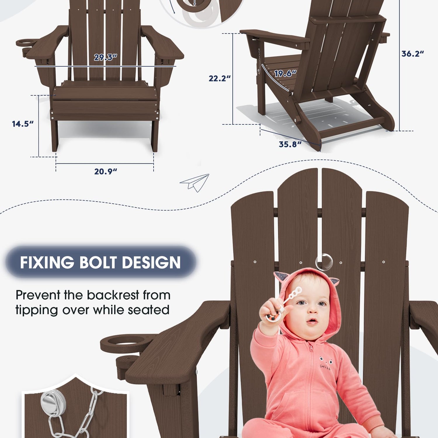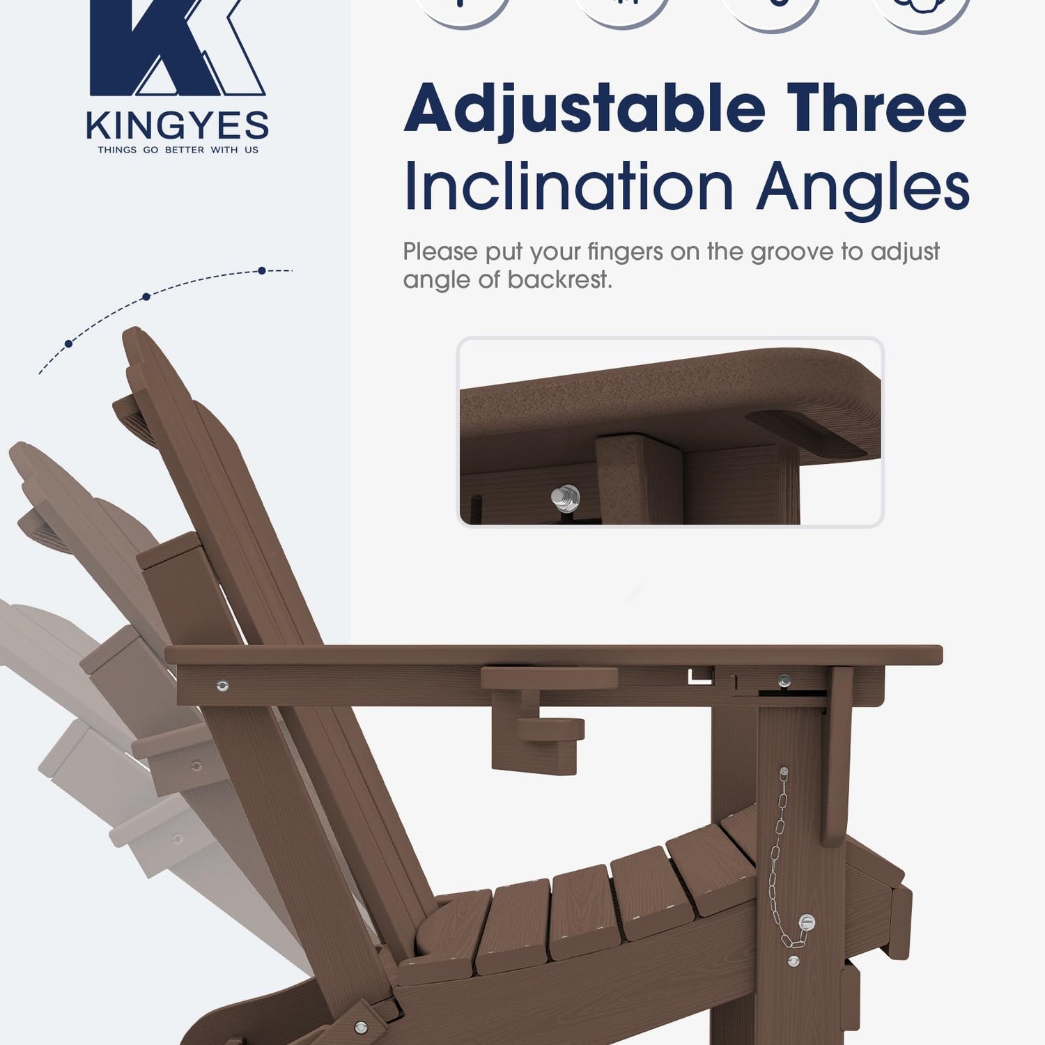 KINGYES Adjustable Folding Adirondack Chair, HDPE Reclining Adirondack Chair with Cup Holder, All Weather Resistance Embossing Oversize Adirondack Outdoor Chair, Brown