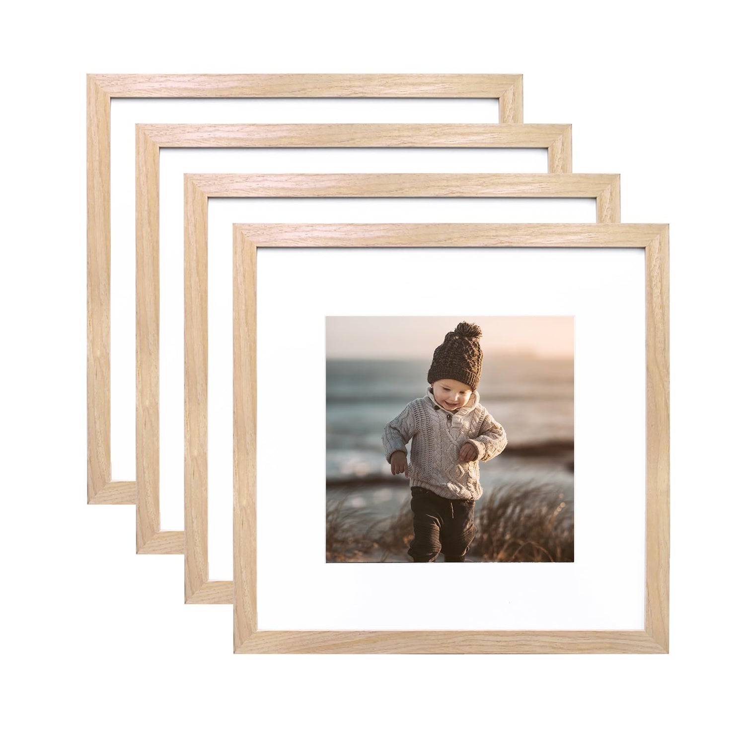 KINLINK 12x12 Picture Frame, Natural Square Solid Wood Frames for Pictures 8x8 with Mat or 12x12 without Mat, Wall Display Photo Frames Natural Wood 4 Pack