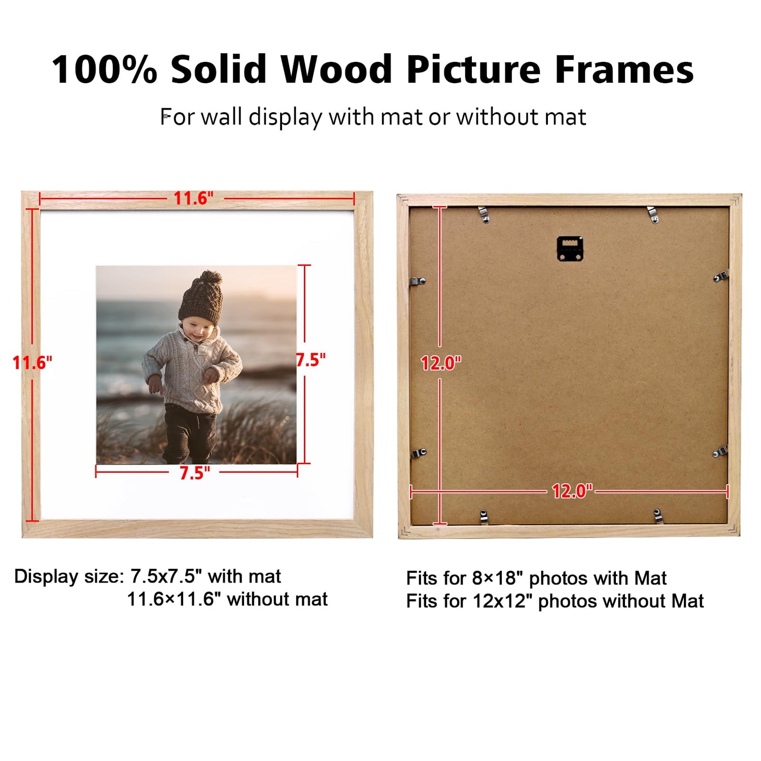 - VERSATILE DISPLAY: You can display these wood wall frames 12x12 in various ways like hanging them on the wall with 8x8 mat or without mat for 12x12 pictures. It is awesome to create a personalized gallery wall. Hanging hardware and non-trace nails are include in the package.