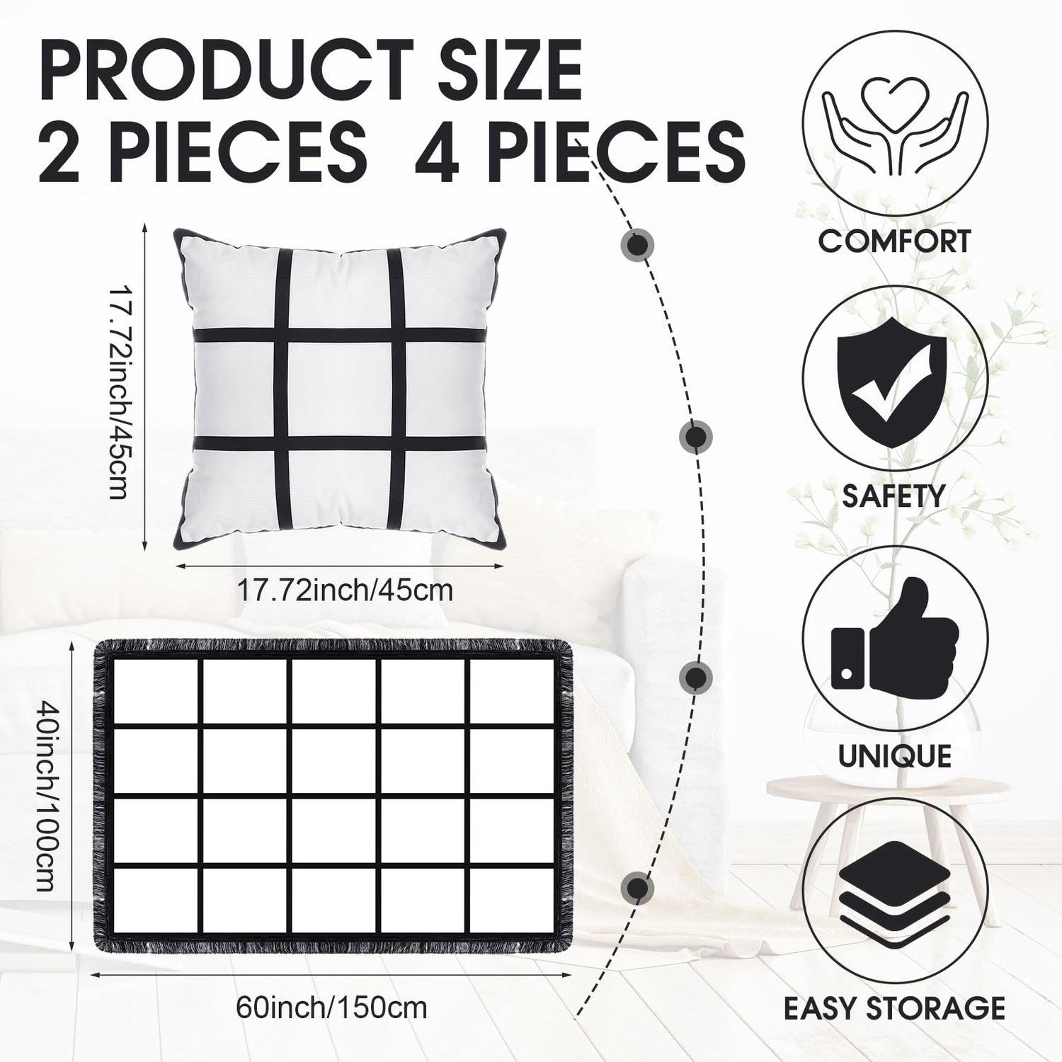 - Size Information: the sublimation blanket is about 60 x 40 inches/ 150 x 100 cm with 20 blank panels, the sublimation pillow cover is about 17.7 x 17.7 inches/ 45 x 45 cm with 9 blank panels, enough space for you to print your own design, logo, or image onto the fabric, resulting in a novelty and meaningful product