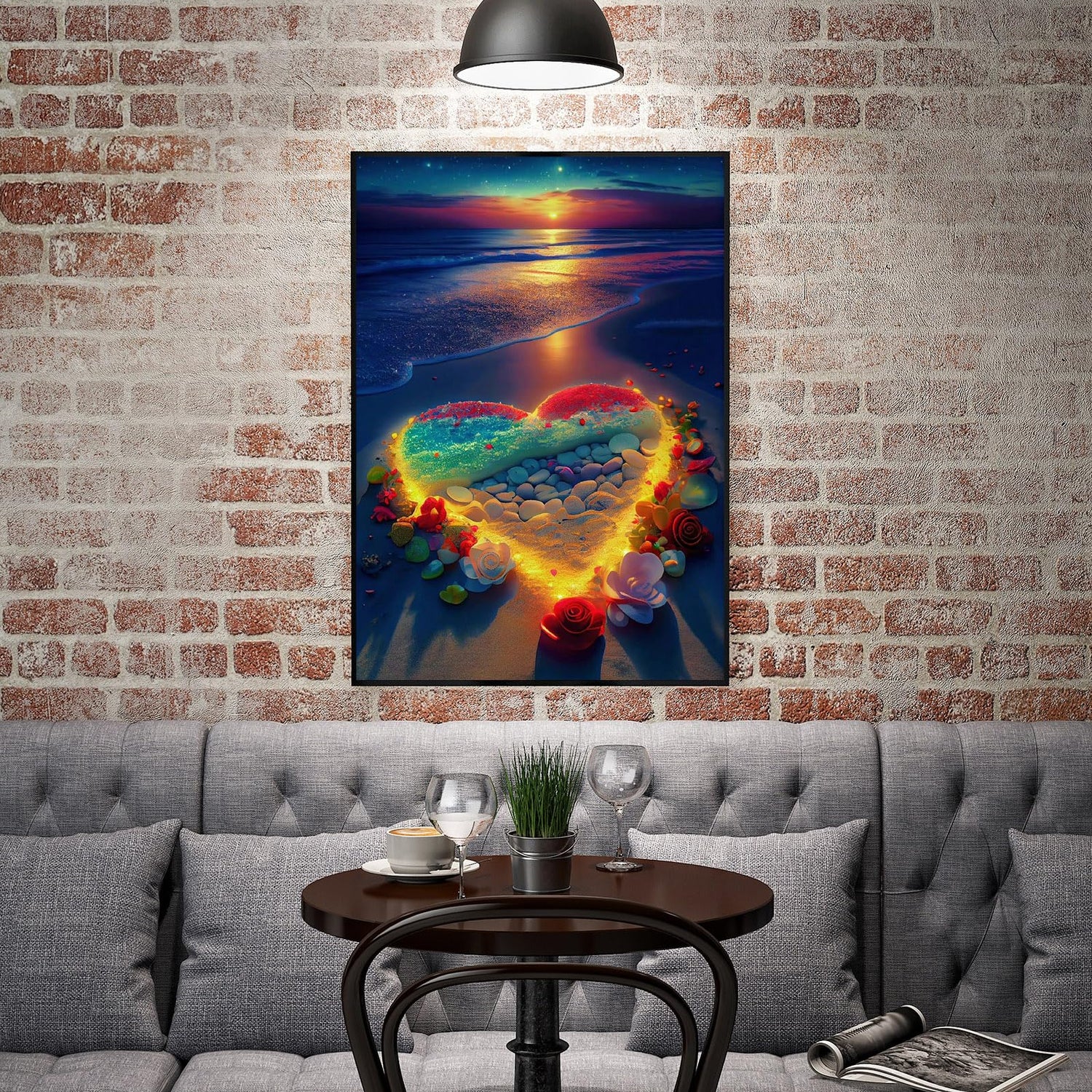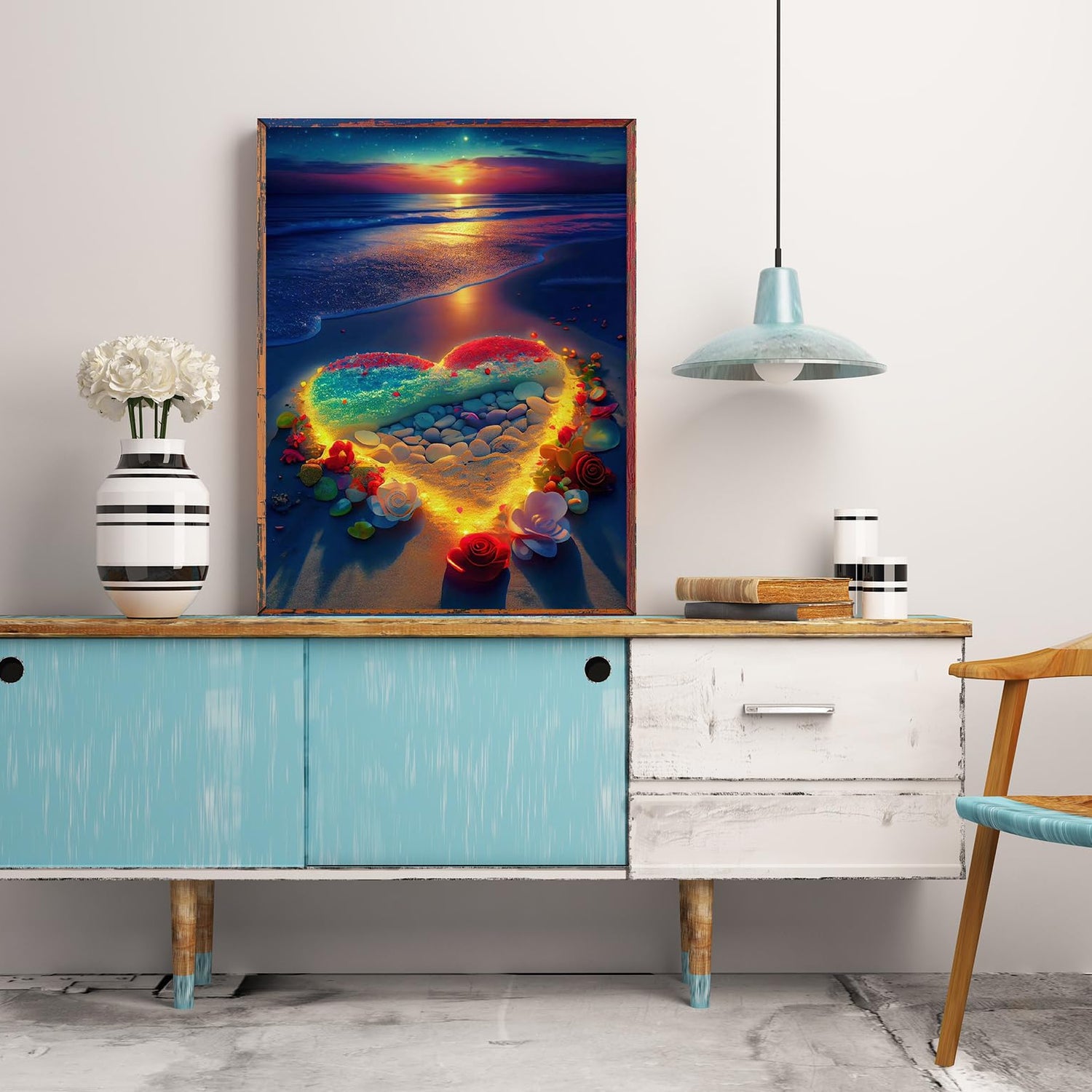 KINPLUB Heart Beach Diamond Painting Kits for Adults, 5D Sunset Diamond Art Kits for Beginners, DIY Full Drill Seaside Paint with Round Diamond Dots, Home Wall Decor 12 x 16 Inch
