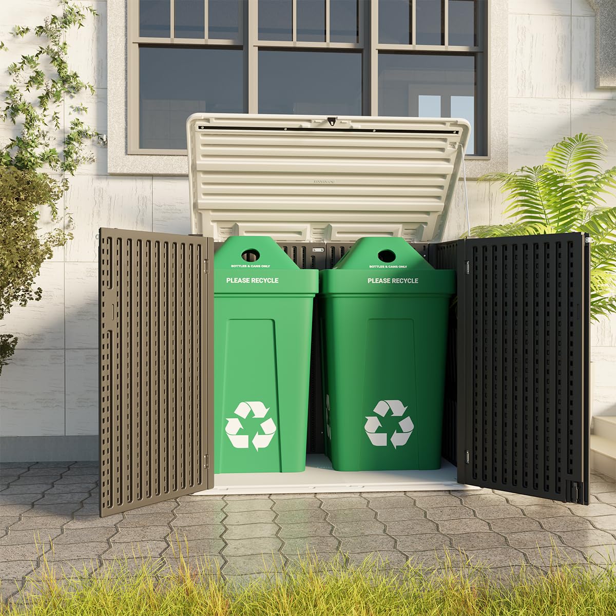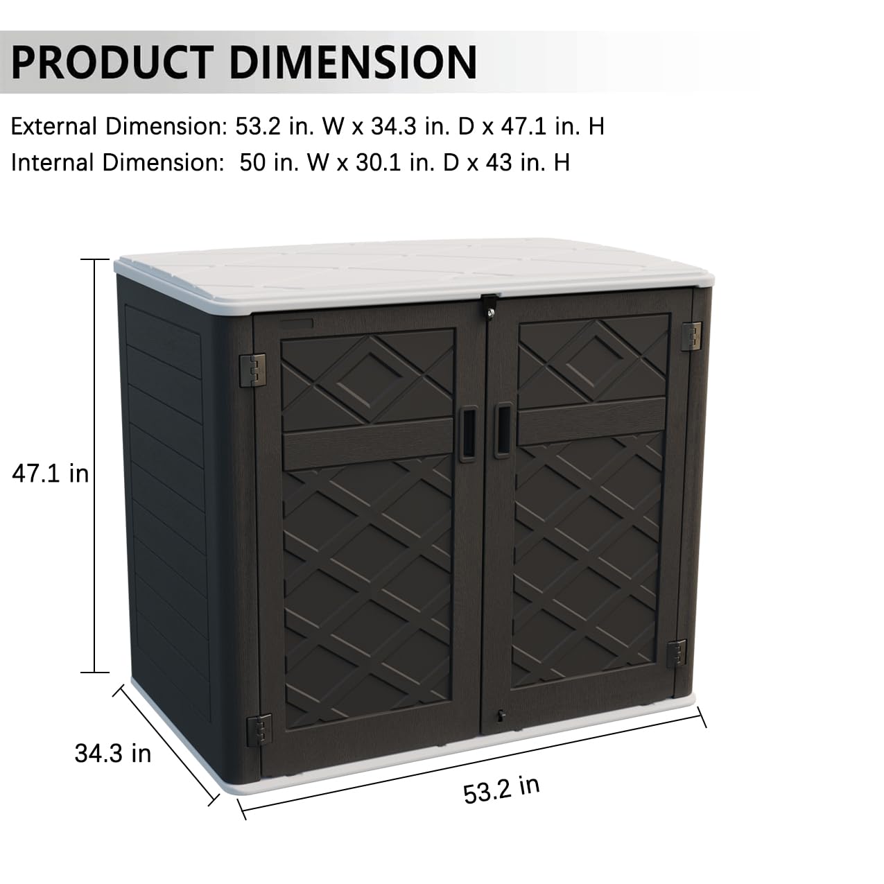 - 【Larger Capacity for Outdoor Storage】— External Size: 53.2 in. W x 34.3 in. D x 47.1 in. H; Interior Size: 50 in. W x 30.1 in. D x 43 in.H, Capacity: 48 Cubic Feet.This upgraded larger storage shed more perfectly store outdoor items, such as trash cans, garden tools, firewood and more suitable for all kinds of occasions: indoor, outdoor,balcony, yard, garden, street, etc.