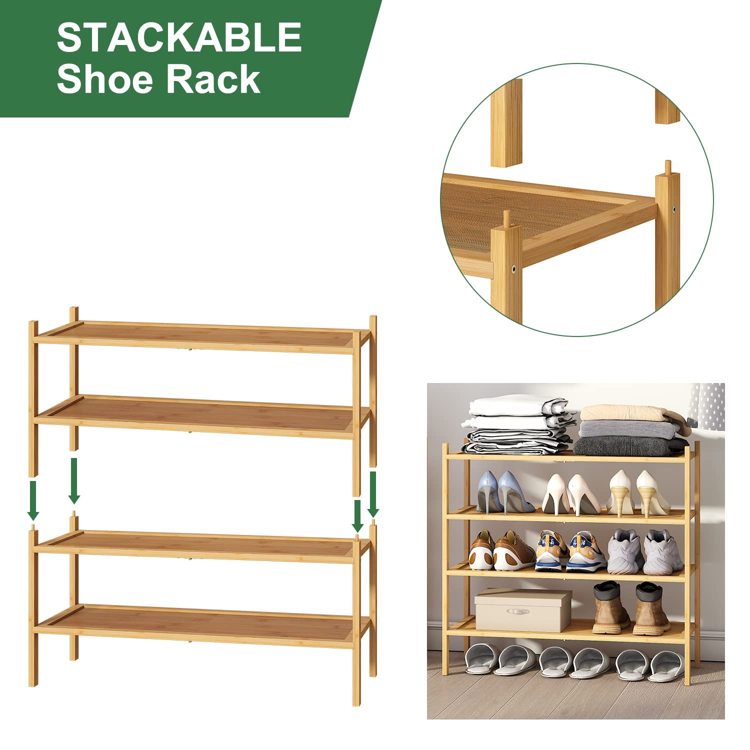 kiplant 4-Tier Shoe Rack for Entryway, Bamboo Wood Shoe Rack 4-Tier, Stackable Shoe Organizer for Closet, Free Standing Shoe Racks for Indoor & Outdoor