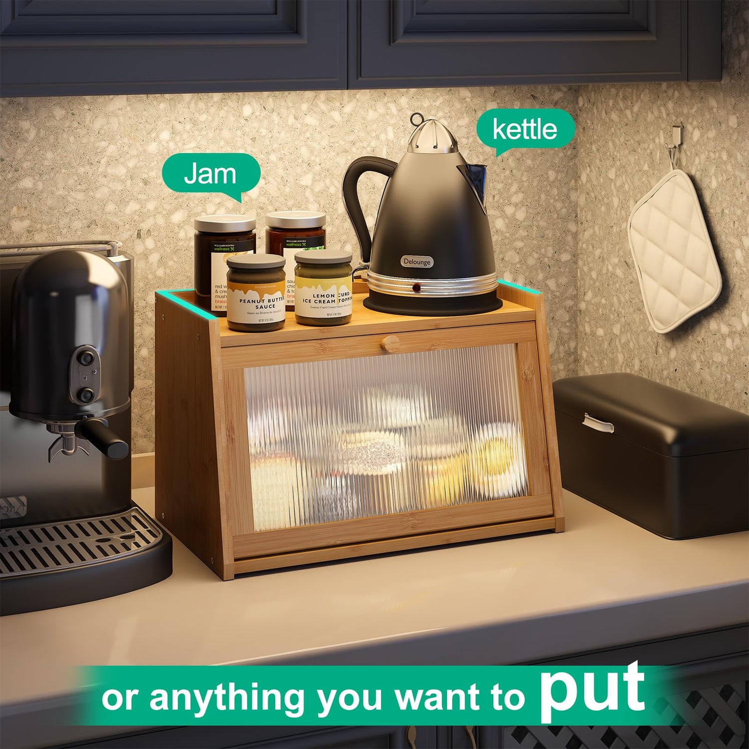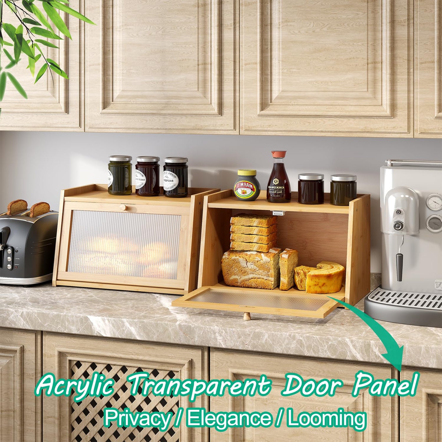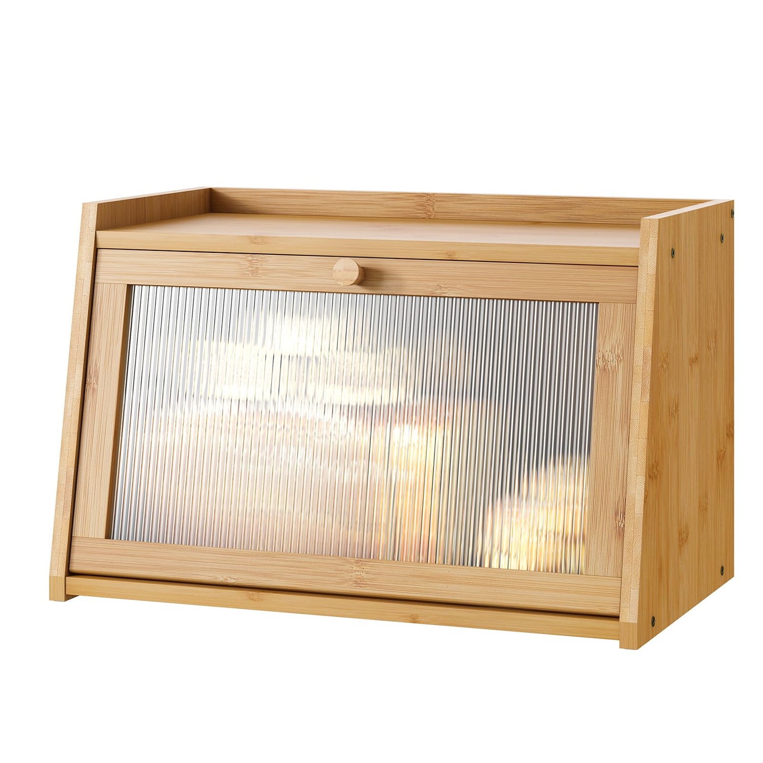 kiplant Bread Box for Kitchen Counter, Large Bamboo Bread Storage Container with Wavy Arcylic Transparent Door, Bamboo Wooden Farmhouse Bread Box for Your House (Natural)