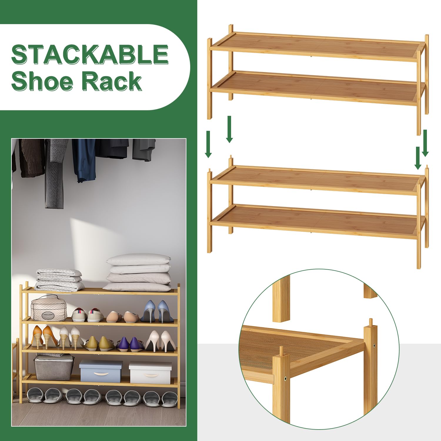 kiplant Long Shoe Rack, 4-Tier Bamboo Wood Shoe Rack, Stackable Shoe Rack for Closet, Entryway & Hallway