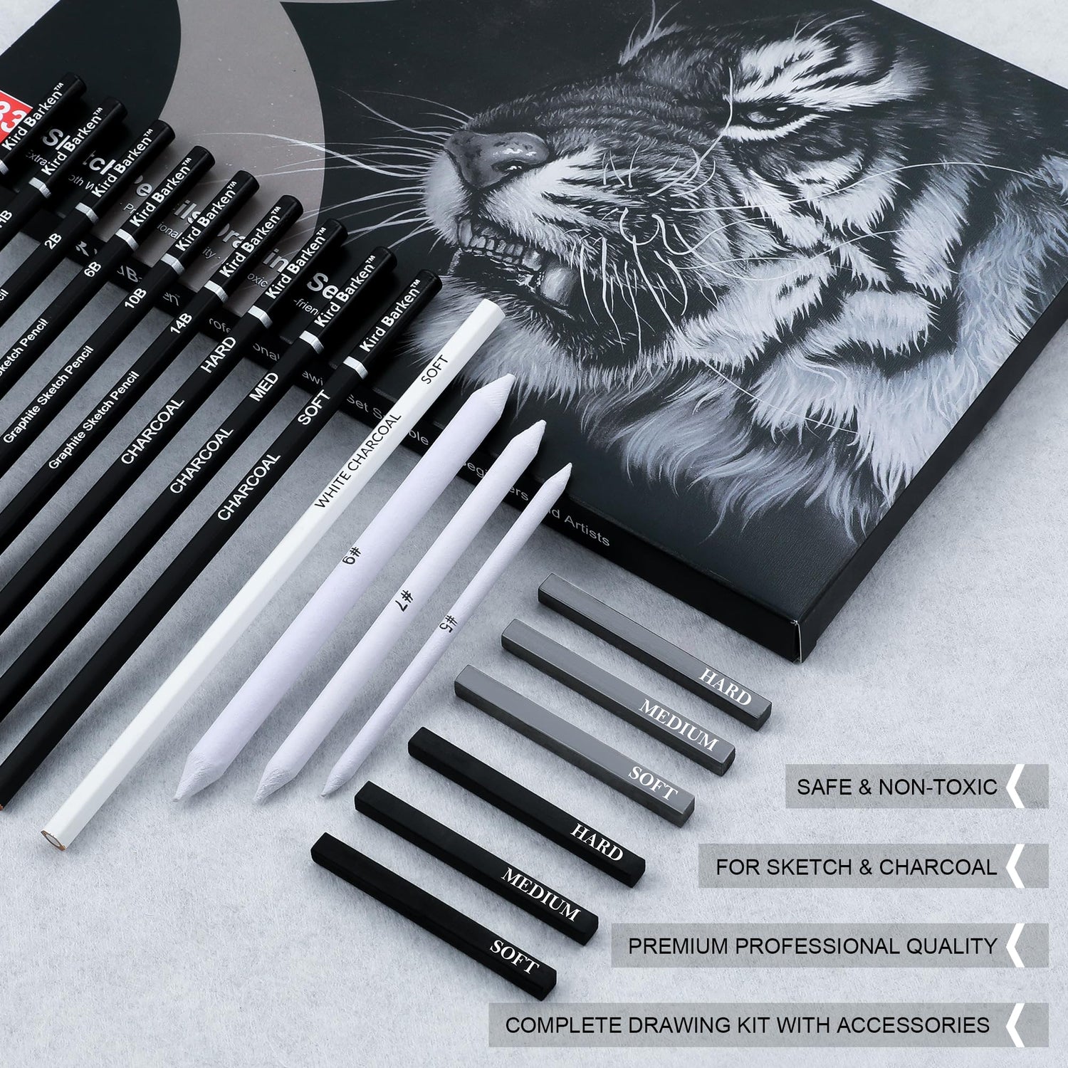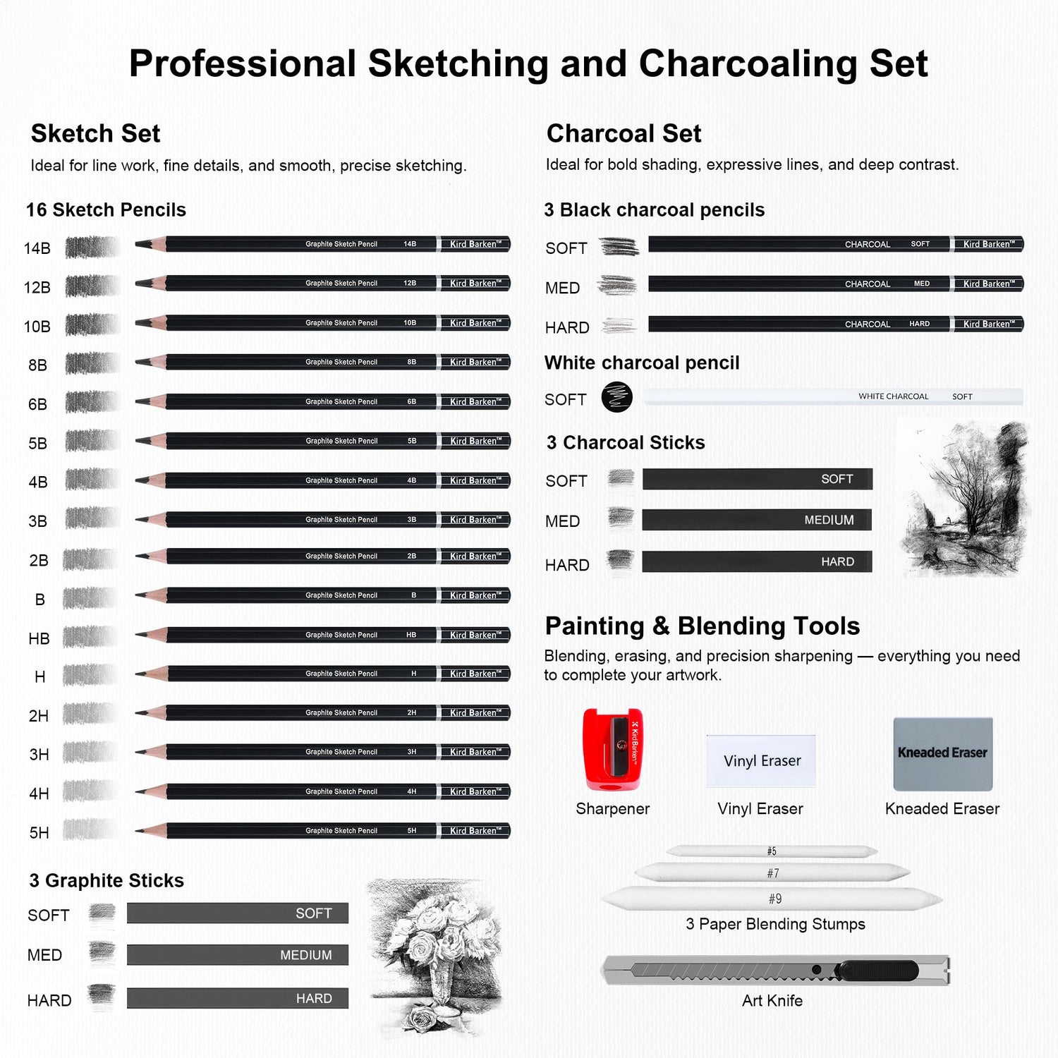 Details: Kird Barken 33-Piece Professional Sketching Set This all-in-one drawing kit includes 16 graphite pencils (5H–14B), 3 black charcoal pencils (soft, medium, hard), 1 white charcoal pencil, 3 blending stumps, 3 compressed charcoal sticks, 3 graphite sticks, a craft knife, a pencil sharpener, a kneaded eraser, and a vinyl eraser. Whether you're sketching detailed portraits, creating dramatic shading, or blending tones, this set has everything artists of all levels need for creative expression.
