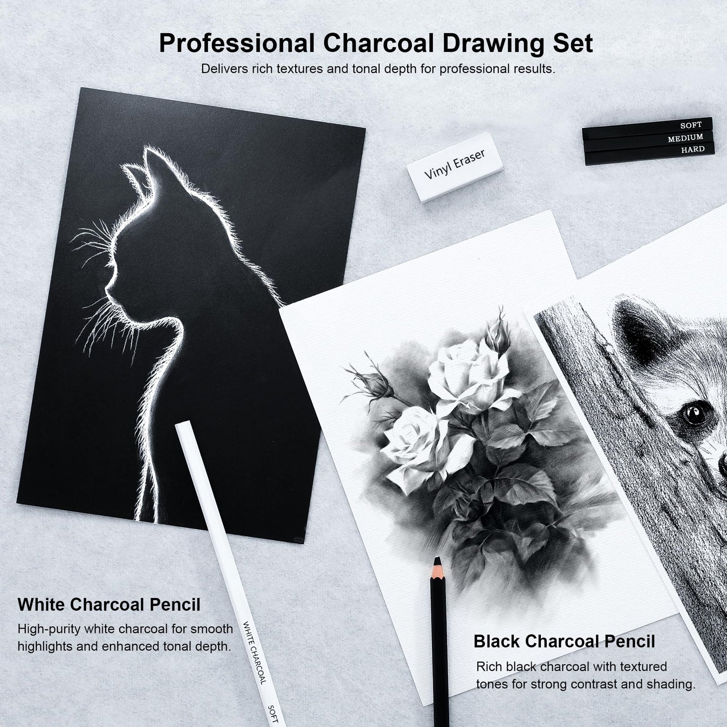 - Professional Charcoal Tools – Charcoal pencils offer deep, rich black tones for shadows and expressive textures, while white charcoal pencil creates striking highlights on toned or black paper. charcoal sticks allow broad coverage and intense contrast. Includes an art knife for precise sharpening of all types of charcoal pencils.
