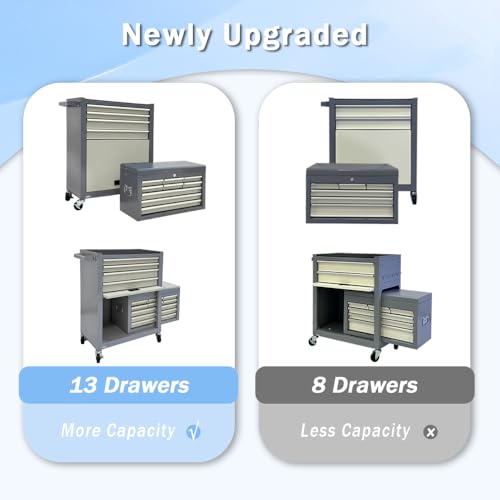 Kirmosal 13-Drawer Tool Chest with Wheels,2 in 1 Detachable Rolling Tool Chests with Drawers,Large Tool Box with Lock,Mobile Steel Tool Cabinet Storage for Warehouse,Garage-Grey&White