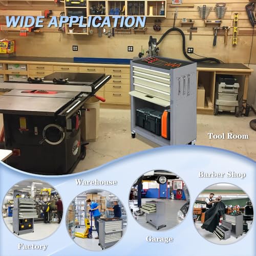 - 【Easy to move】: Our tool chest has four flexible universal wheels, and two of them have braking function. A locking bar will prevent the drawers from sliding out and the cabinet door from opening while rolling. Also, top box with 2 handles, easy to take and lift, and bottom tool cabinet with a hand bars,which help you to move forward.