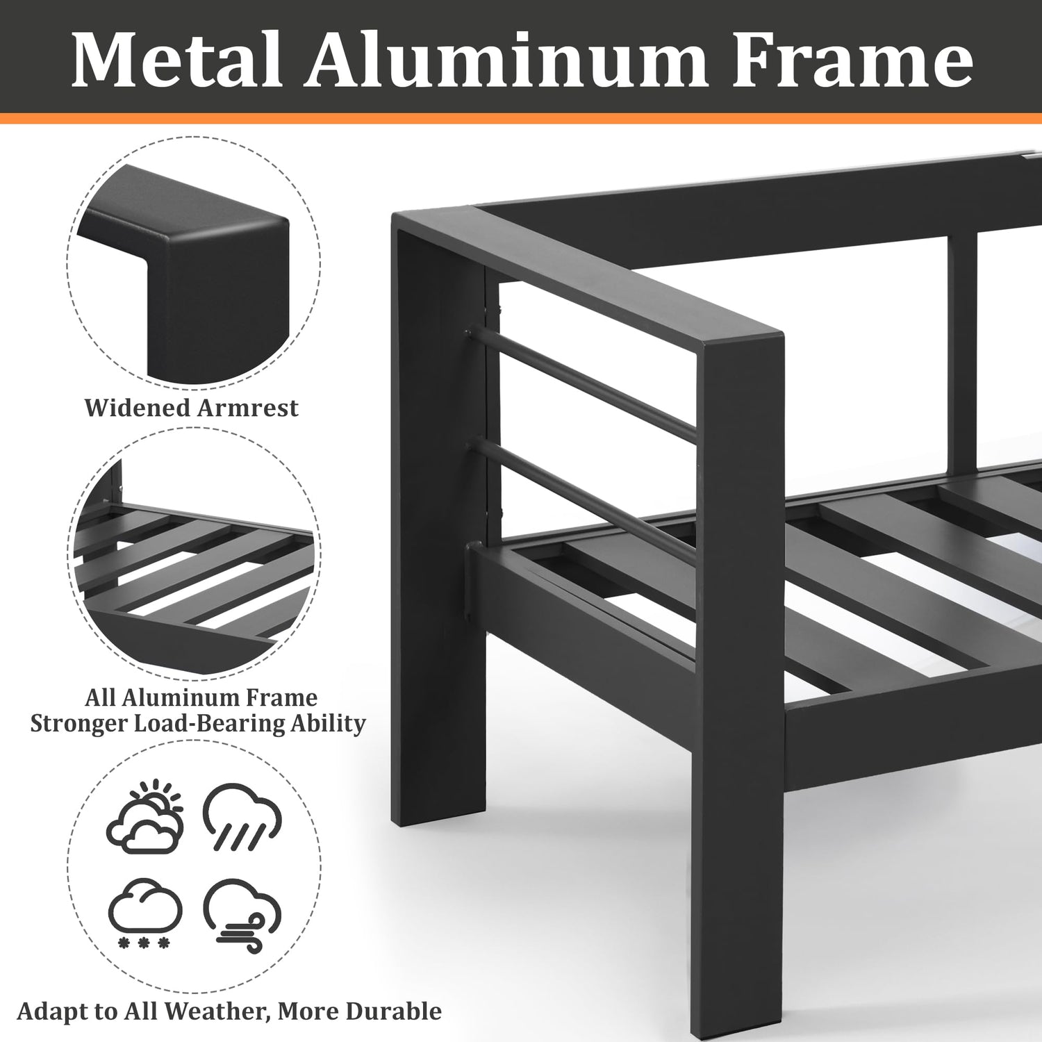 - 【Premium Material】: The outdoor patio furniture uses an all-aluminum frame structure, which is very strong, and the frame broadens the armrest, making it have stronger support. The single seat can bear 300LBS. It can be placed outdoors all weather, has a long service life, is waterproof and rust resistant, even can resist risks even in harsh conditions. Note that if couches for patio are placed in the rain for a long time, you ‘d better shelter with furniture covers for using more years.