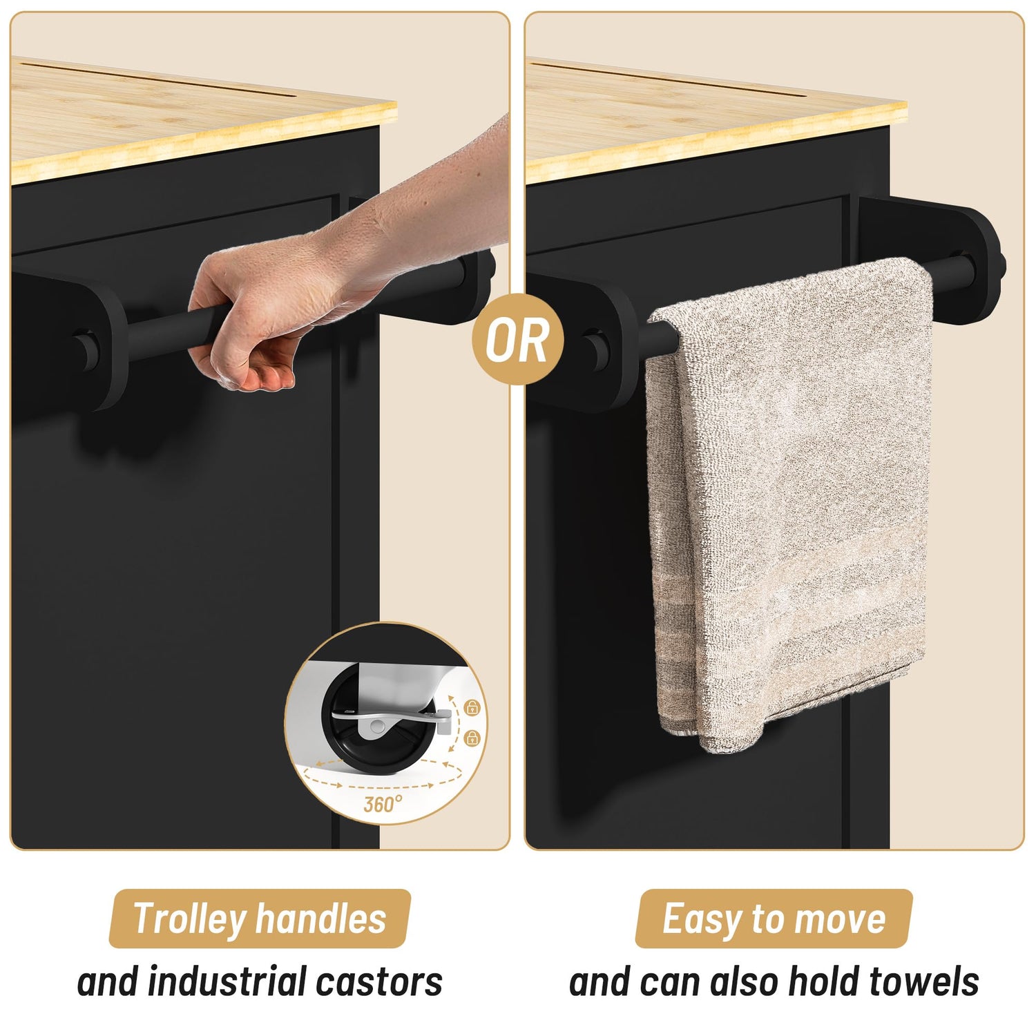 - Mobile Kitchen Island Cart: This rolling kitchen island comes with 4 industrial castors and handles, providing mobility and stability to move it anywhere. Two of the castors are lockable, ensuring that it can be fixed when needed.