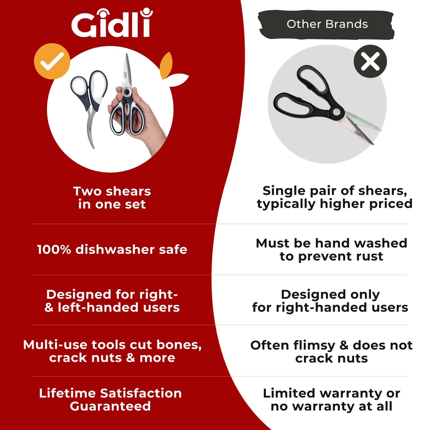 • Lifetime Guarantee for Peace of Mind: Invest in the professional kitchen shears and seafood scissors set with confidence. Experience their practicality, durability, and utility in your kitchen – you'll wonder how you lived without them. Should you, for any reason, find yourself unsatisfied, we offer a money-back guarantee. With Gidli's lifetime satisfaction guarantee, this purchase is 100% risk-free (** One time replacement per order). Don't hesitate – place your order now and elevate your kitchen experience!