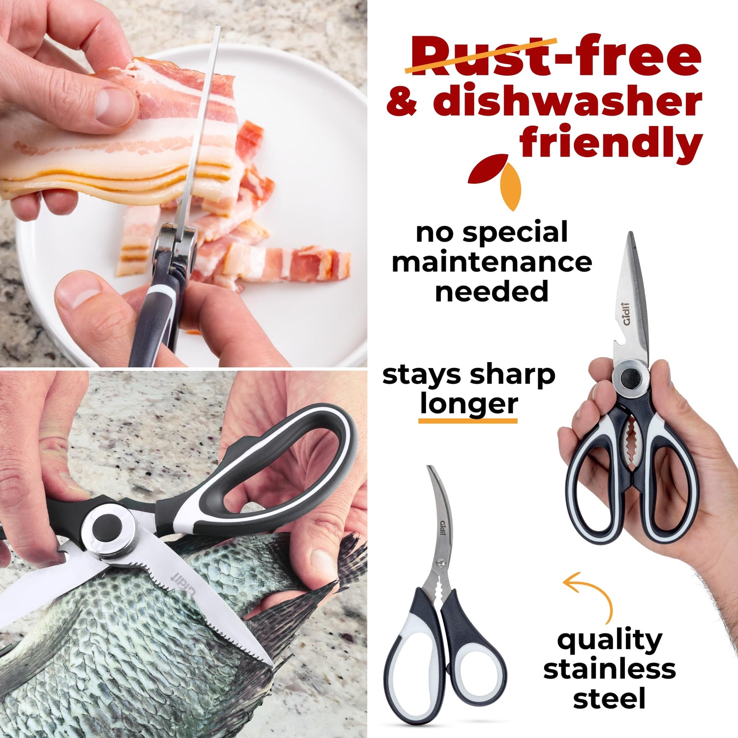 • User-Friendly and Easy Maintenance: Designed with ergonomic handles, our right and left Handed kitchen shears and seafood scissors provide a comfortable and secure grip for all your cutting needs. After use, toss them in the dishwasher or hand wash effortlessly. The high-quality stainless steel ensures these tools stay in top-notch condition, ready for your next culinary adventure. Dishwasher Safe.