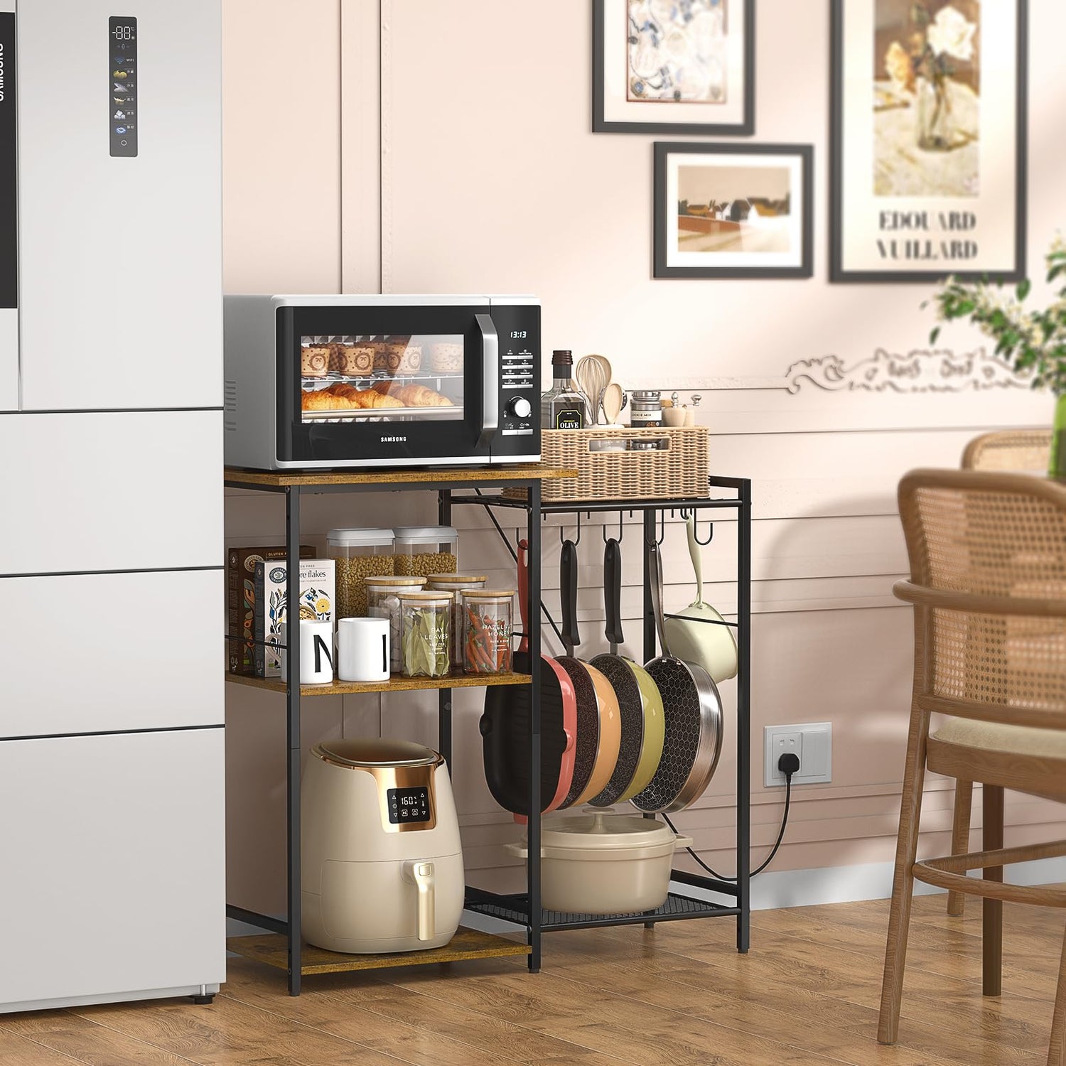 Rustic Brown 5-Tier Kitchen Stand with Pots Rack and 6 S Hooks - Multifunctional Storage Solution for Microwaves and Coffee Bars