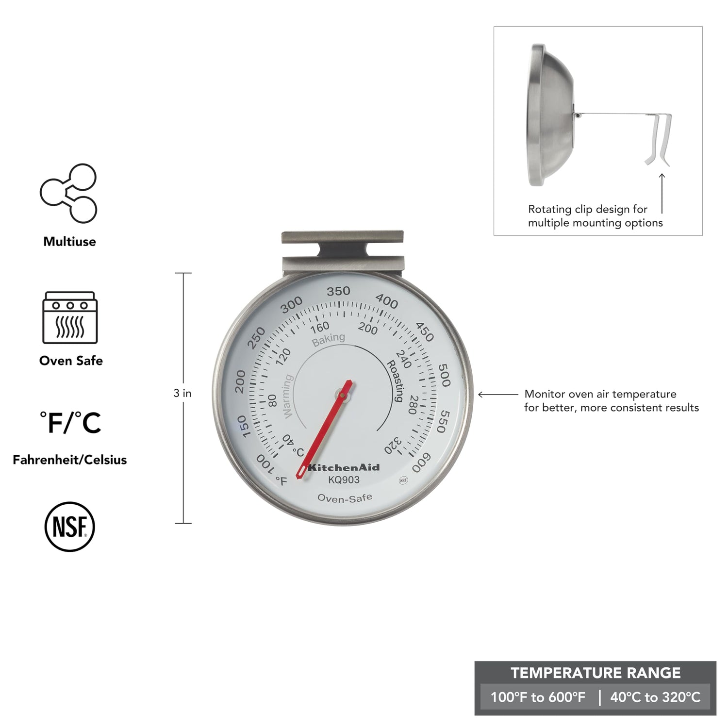 Details: Ensure your food is cooking at the proper temperature with this large dial oven thermometer from KitchenAid. An extra-large, colorful 3" Dial makes this oven thermometer easy-to-read. The oven temperature gauge also features a shatter resistant tempered glass lens with a Red Pointer to indicate accurate temperatures from 100 to 600 degrees Fahrenheit. Stainless steel construction provides strength, durability, and corrosion resistance. Uniquely designed for all oven types, This large dial thermometer can be hung from a rack or stand on its own with the innovative rotating clip on the back. Nsf listed.