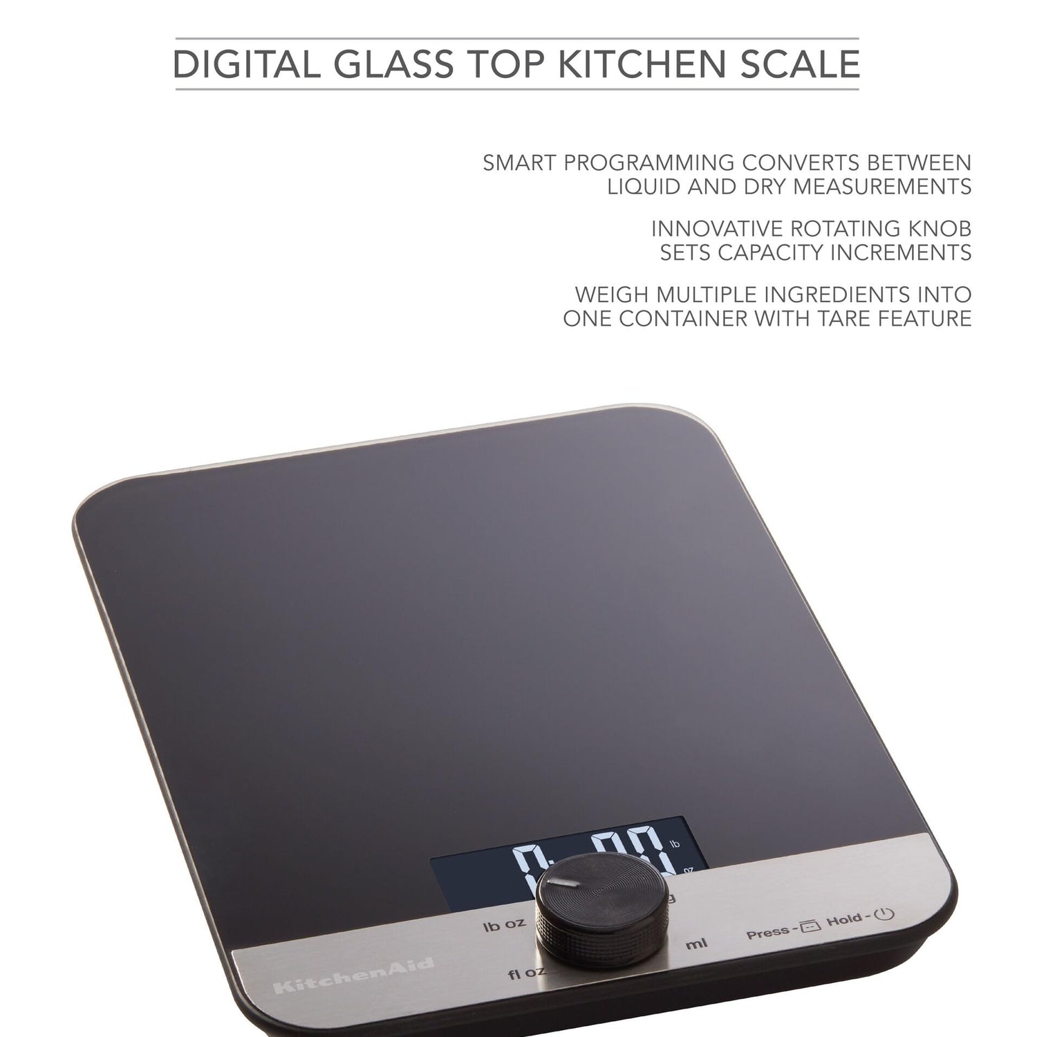 Details: The sleek KitchenAid 11lb Glass surface kitchen scale features an attractive, stainless steel accent trim and an oversized knob to set units of measurement. This scale will match many kitchen decors. Glass is a naturally stain and odor free surface and is tempered for safety. The large 1. 0" Backlit readout is easy-to-read. An add and weigh Tare function helps to zero out weights of containers before adding food or weighing multiple ingredients together. Conveniently converts both dry and liquid measurements.