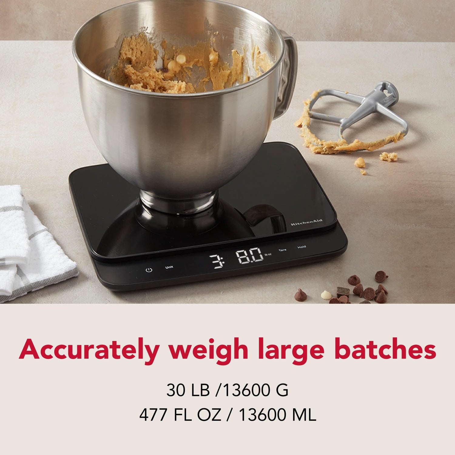 KitchenAid KQ917 High Capacity Glass Surface Digital Kitchen and Food Scale, 30 Pound Capacity and Precision, Grams, Ounces, Pounds, Fluid Ounces & Milliliters, LED, Tare Function, Black