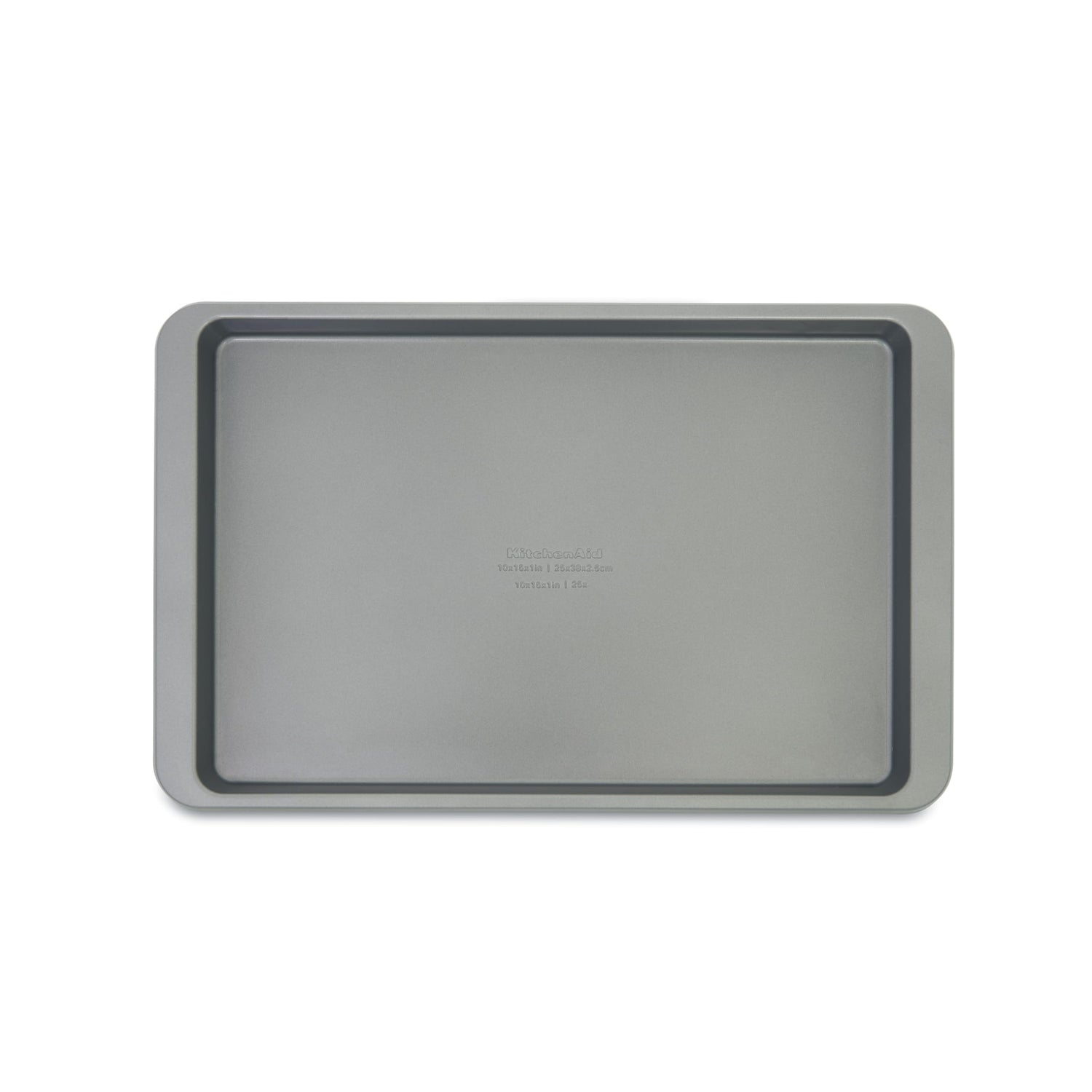 Details: The KitchenAid 10x15-inch Baking Sheet is perfect for making cookies, jelly rolls, sheet cakes, or one-pan meals. Highly durable, this nonstick, oven-safe, heavy-duty aluminized steel pan stands up to high heat for all your baking needs and features a uniquely designed rim to prevent warping. It evenly distributes heat for consistent baking results and has extended handles that provide a secure grip for easy transport. Dishwasher safe.
