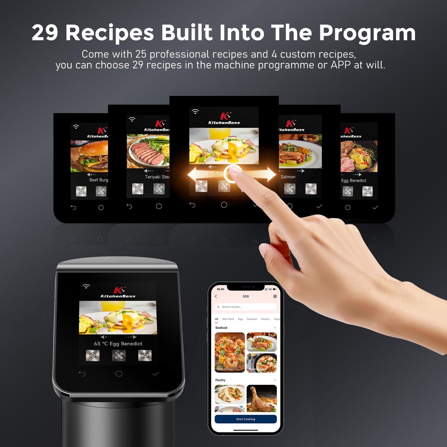 - Colorful Touchscreen LCD Display: G330 Sous Vide with big colorful LCD screen, it can clearly display of 25 original healthy recipes created by famous restaurant chefs and 4 custom recipes, swiping the screen left or right can select recipes you like conveniently.
