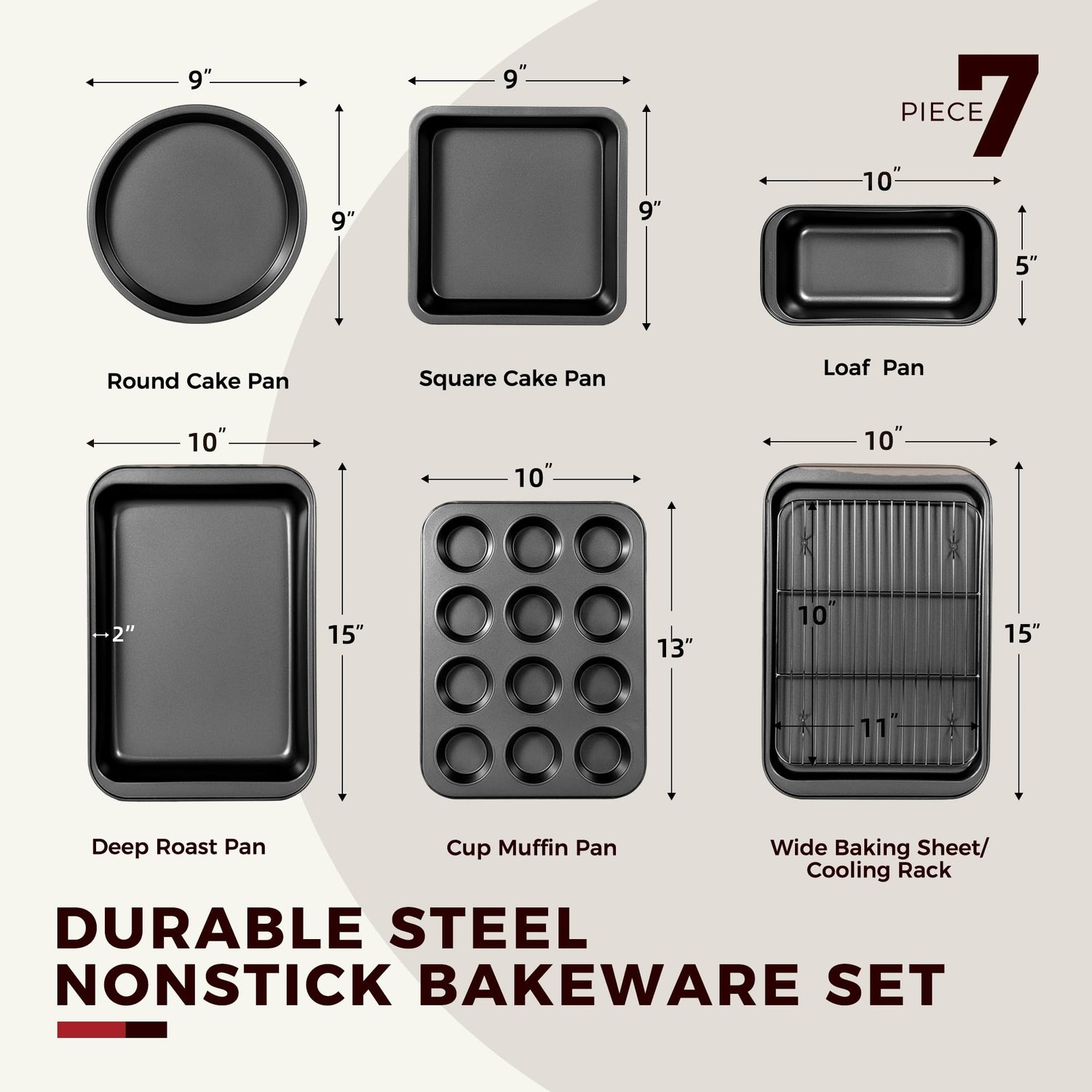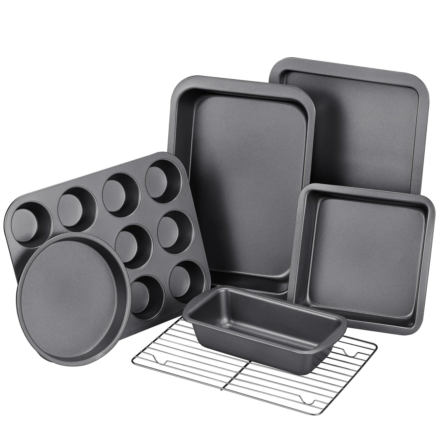 - COMPLETE 7-PIECE BAKEWARE SET - Including a round cake pan, a square cake pan, a loaf pan, a cup muffin pan, a cookie sheet, a cooling rack, and a deep roast pan. All pieces of our baking set were designed to fit neatly into one another, saving you valuable space in your kitchen cabinets. The nonstick baking pans set will fit into regular kitchen cabinets or under standard kitchen ovens.