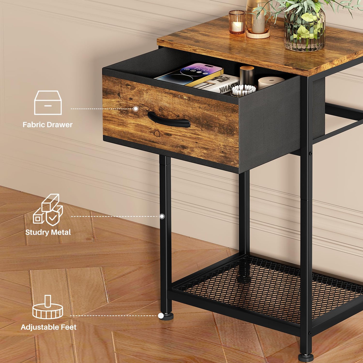 - End Table Set of 2: Standing at 15.75”L x 11.8”W x 24”H, this farmhouse nightstand with drawers combines vintage wooden shelves with black fabric drawers and a sturdy metal frame. The metal mesh bottom shelf adds a modern touch while providing stability, making set of 2 nightstands a functional addition to any home decor