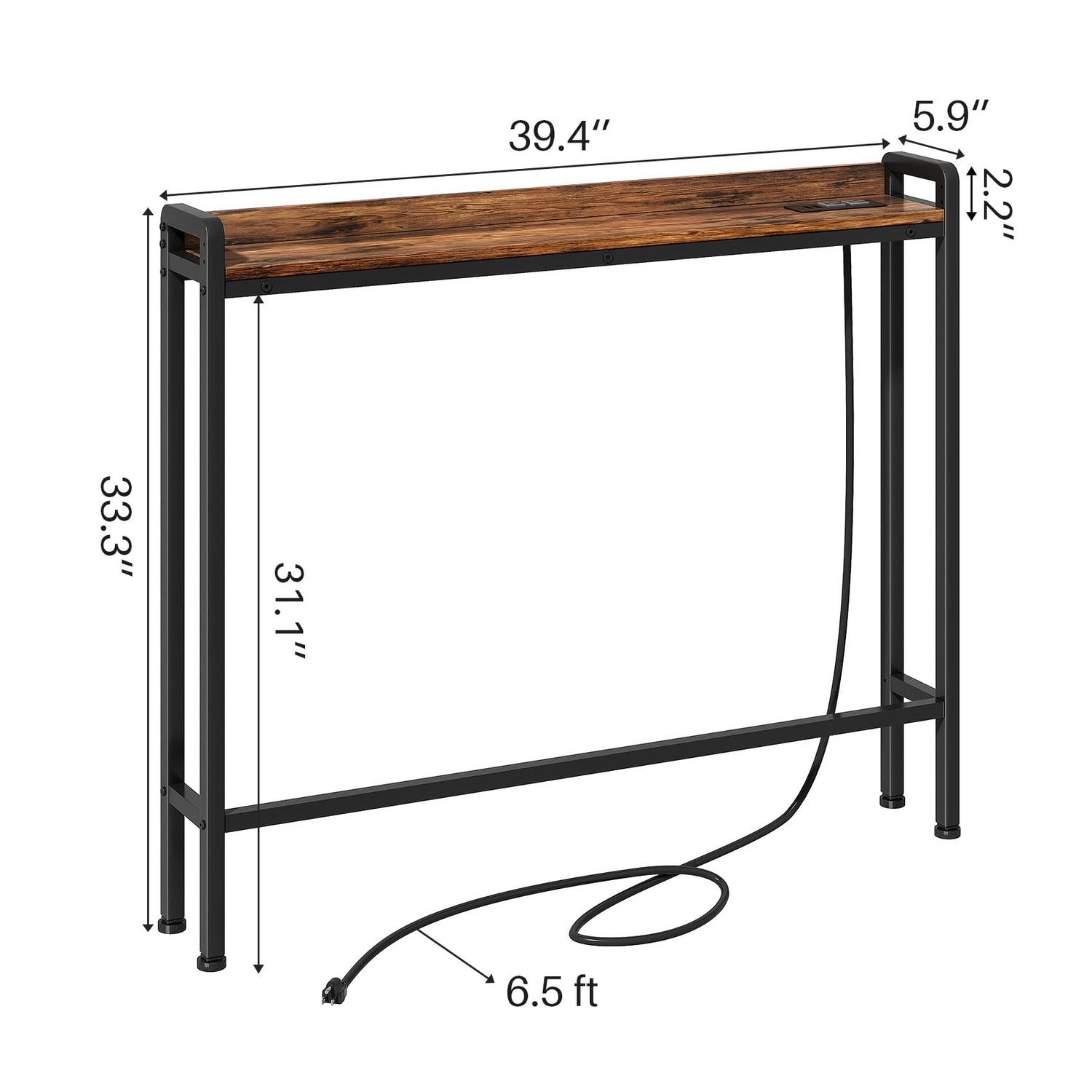 Kitstorack Rustic Brown Narrow Console Table for Behind Sofa, Elevated Rear Fence & Built-in Power Outlets, Includes 6.5' Power Cord, 5.9" D x 39.4" L x 33.3" H