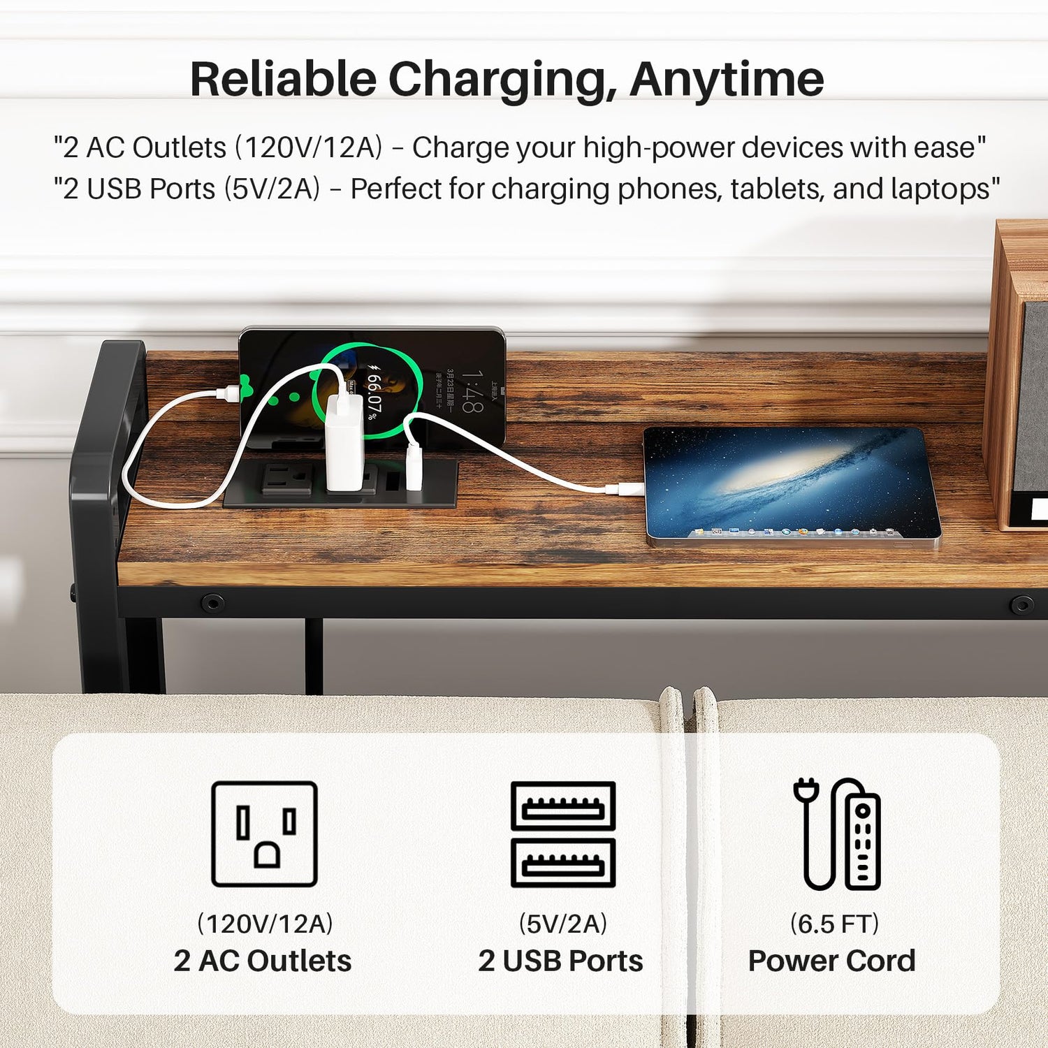 - ✔️Durable and Stable Power Outlets: Equipped with 2 outlets (120V/12A) and 2 USB ports (5V/2A), perfect for charging phones, laptops, tablets, and more. Plus, a 6.5ft heavy-duty power cord for added convenience.