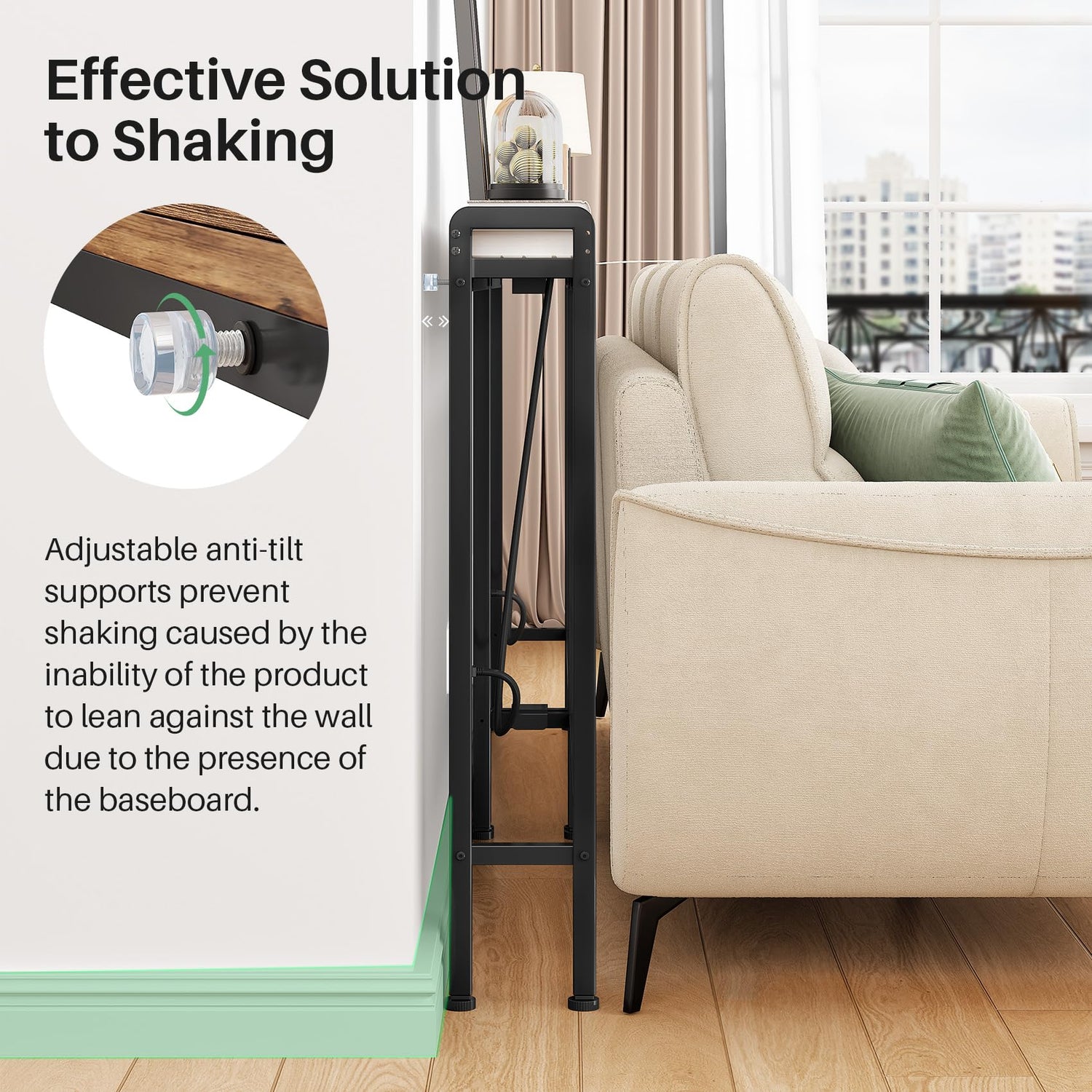 - ✔️ Adjustable Anti-Tilt Mechanism: This sofa console table includes an adjustable anti-tilt mechanism that fills the gaps created by baseboards commonly found in US households, preventing tipping and ensuring stability even on uneven floors.