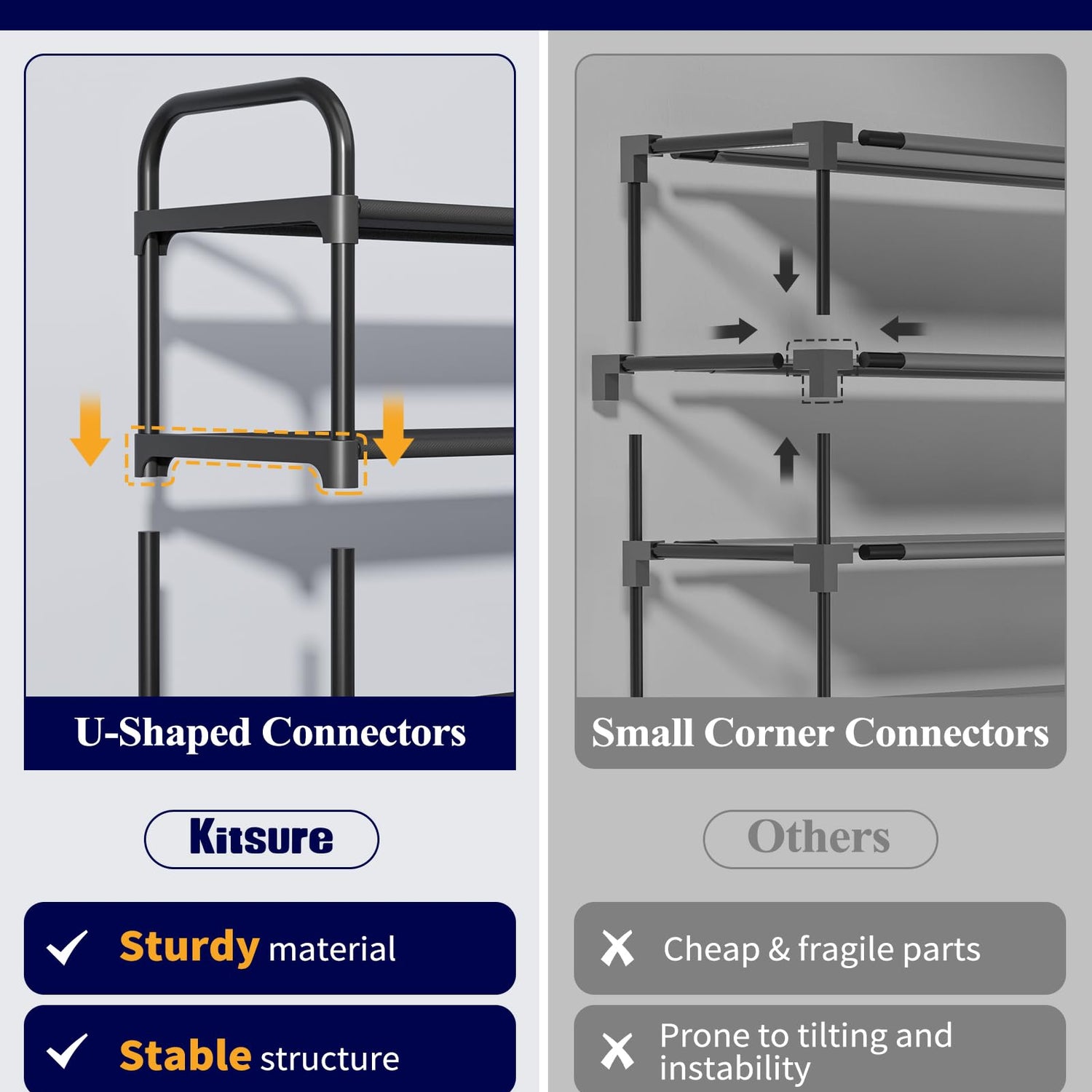 - VERSATILE USAGE: With its flexible design, this shoe rack is ideal for multiple spaces. You can place it near the entryway for quick access to shoes or integrate it into your wardrobe to organize your shoe collection. It's also suitable for use in the garage as a sturdy tool organizer. Enjoy a tidy shoe storage with Kitsure!