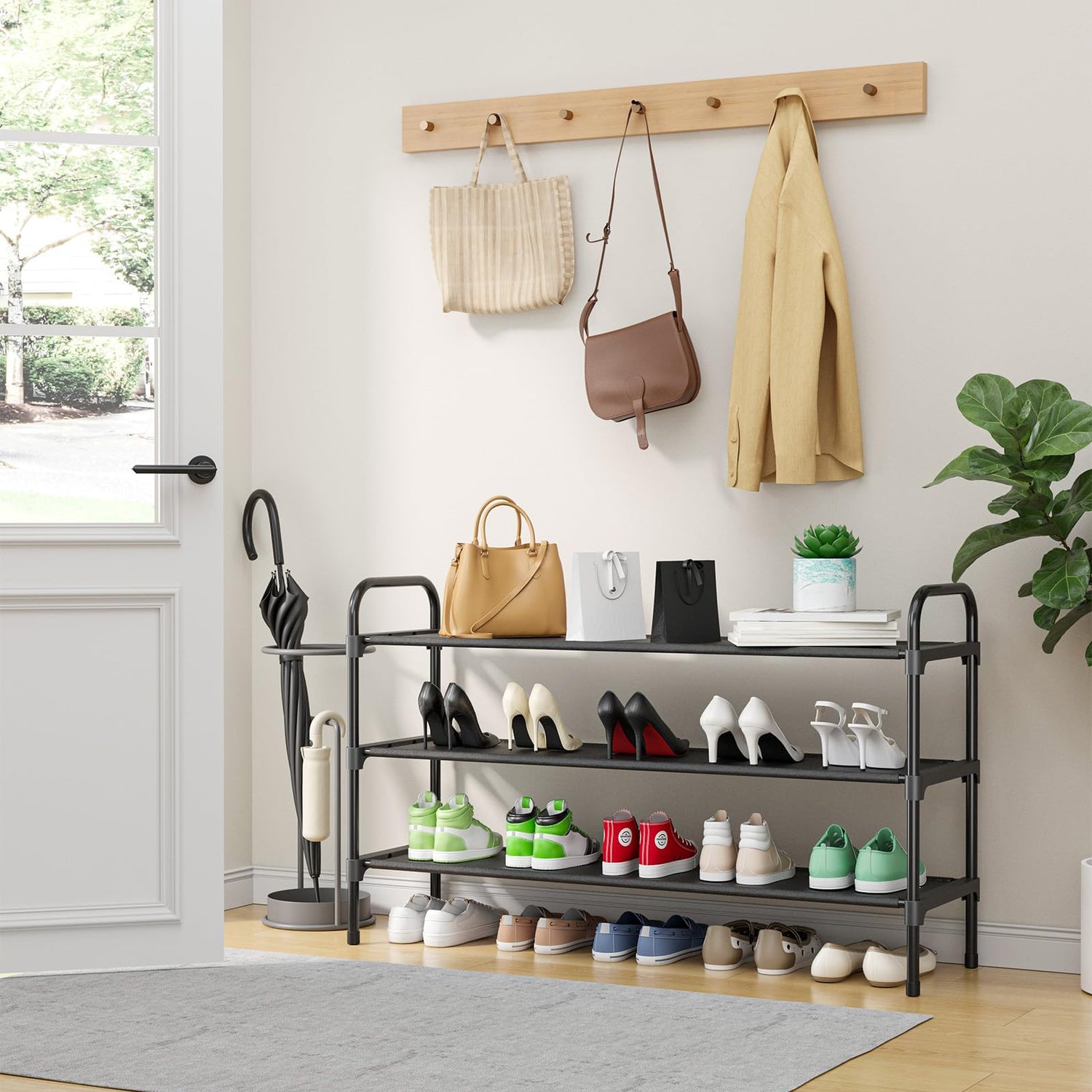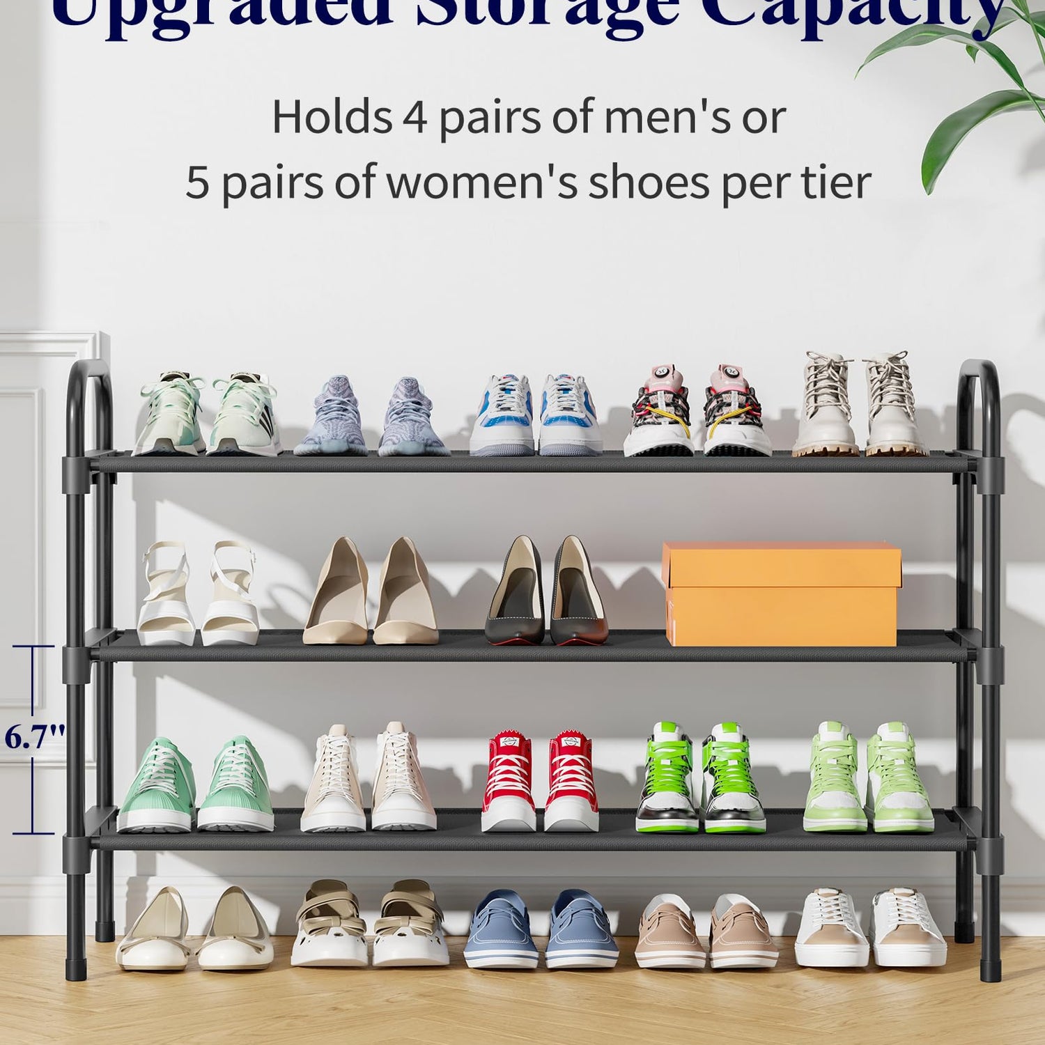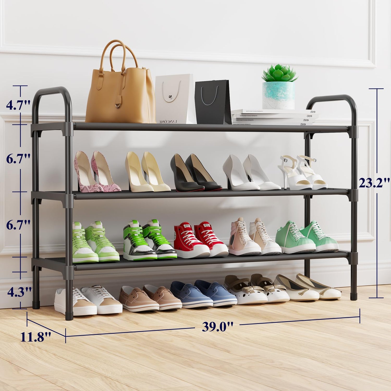 - SPACIOUS STORAGE: Measuring 39.0" x 11.8" x 23.2", this extended 3-tier shoes rack provides extra-wide storage space to hold more shoes. Its bottom tier offers additional room to accommodate flat shoes or slippers, enabling you to utilize every inch of the rack.This shoe rack can hold 4 pairs of men's or 5 pairs of women's shoes per tier.