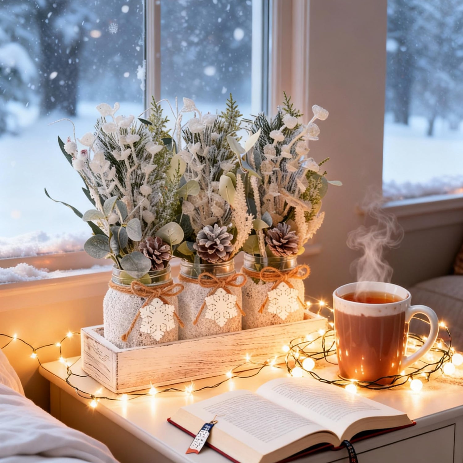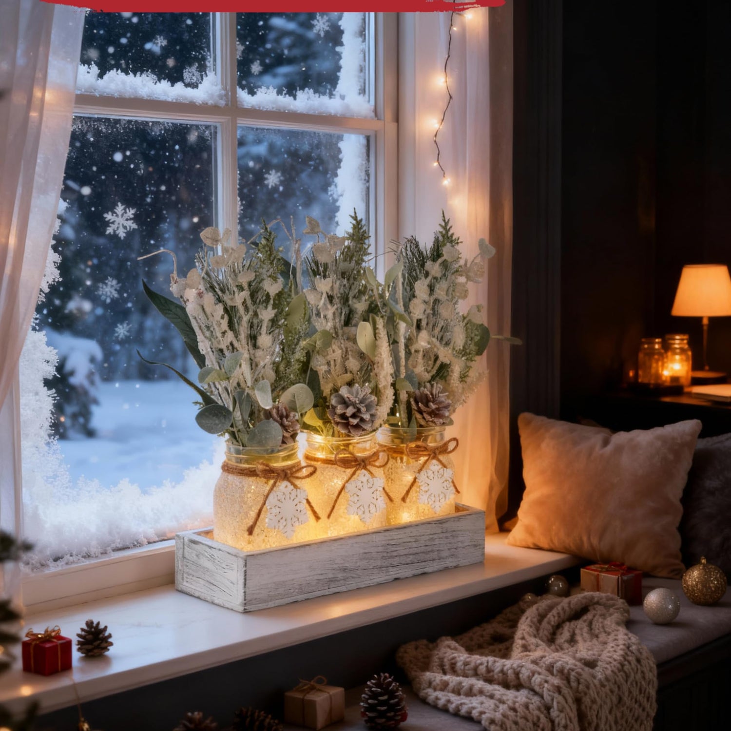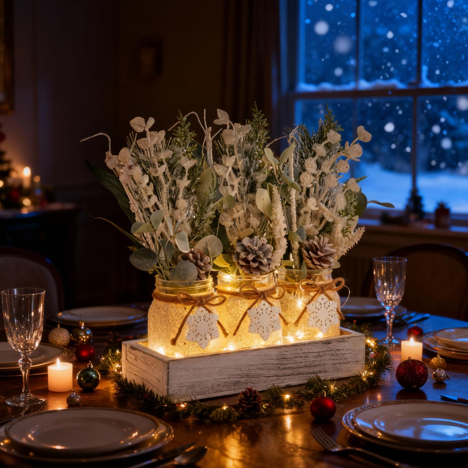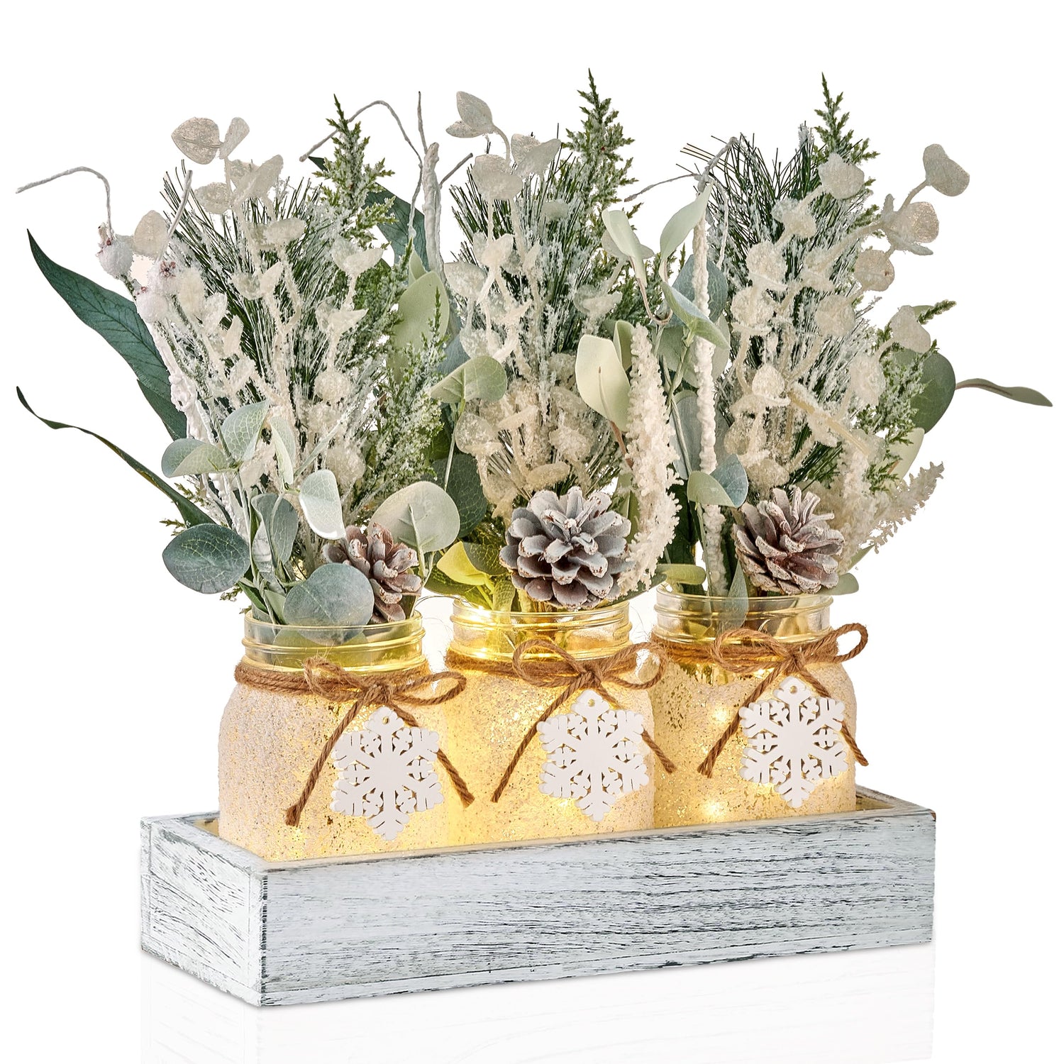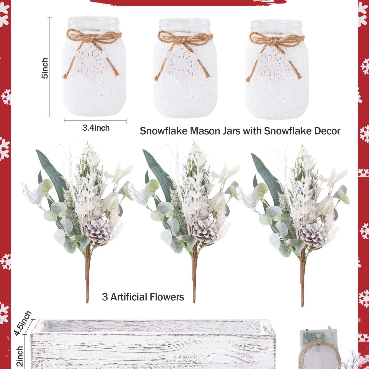 - Winter Table Decor: Our winter centerpieces for table are beautiful holiday decorations. Each jar is beautifully adorned with winter snowflakes decor. It comes with white artificial flowers, a wooden tray. It is a perfect Christmas winter table centerpieces for your winter table decorations. The winter wonderland centerpiece creates a festive atmosphere, making your Christmas table decorations centerpieces truly special.